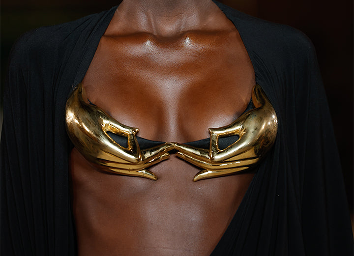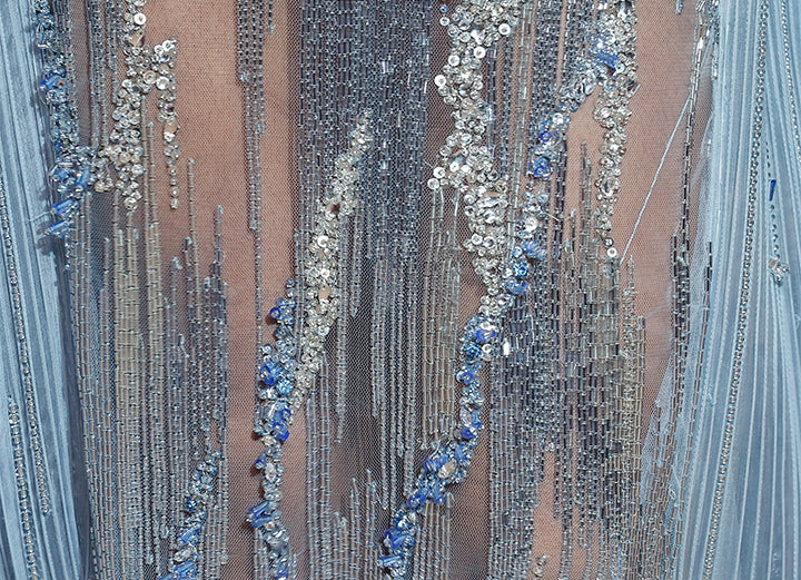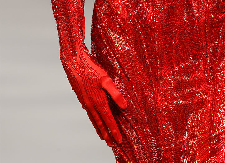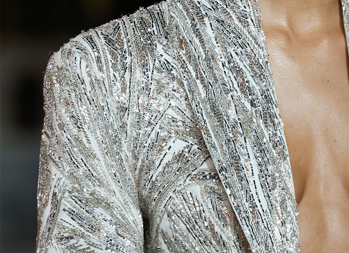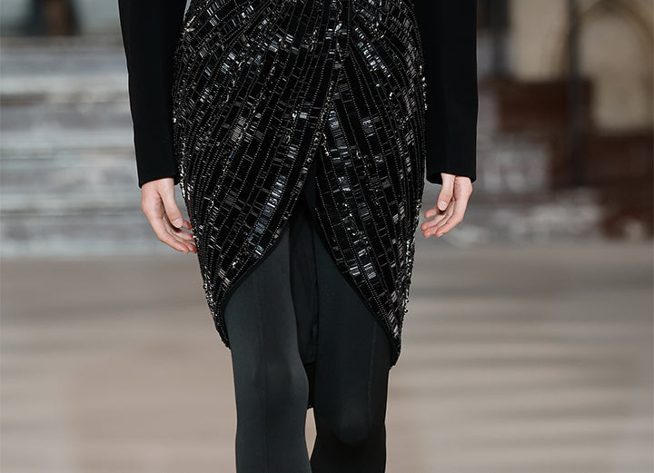 Cropped jackets, exaggerated capes, fluid trench coats and sculpted metal structures come together to paint the surrealism which breathes in ancient Indian texts like the Vedas. Chiffon, woolen suiting’s, tailored textiles are made richer with indigenous techniques like Badla, Mukaish and Zardozi peeping through multi dimensionalcrystals greeting luminescence. The couturier’s signature sculpting art meanders throughout the collection.