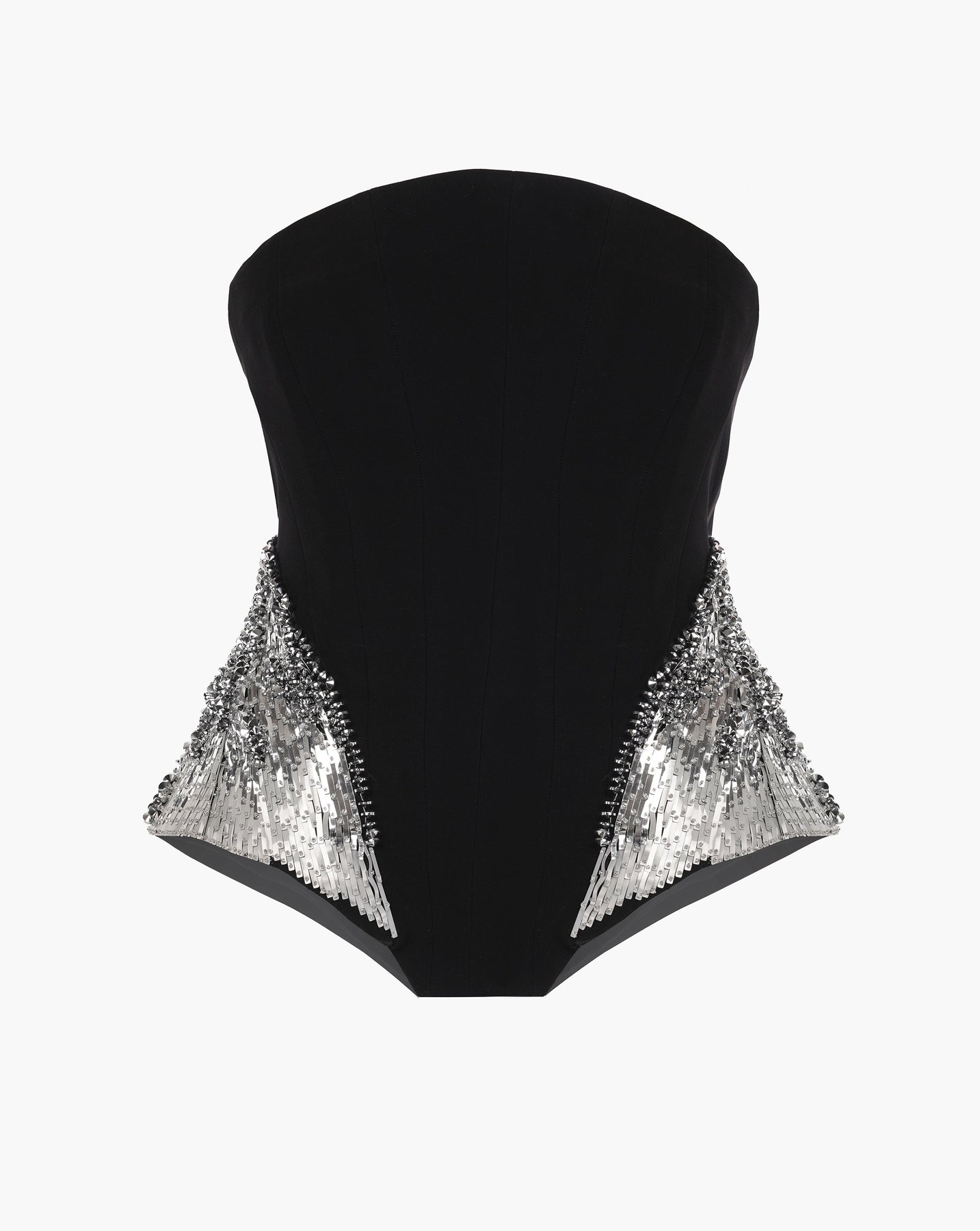 Black corseted peplum top with reptilian embroidery detailing.