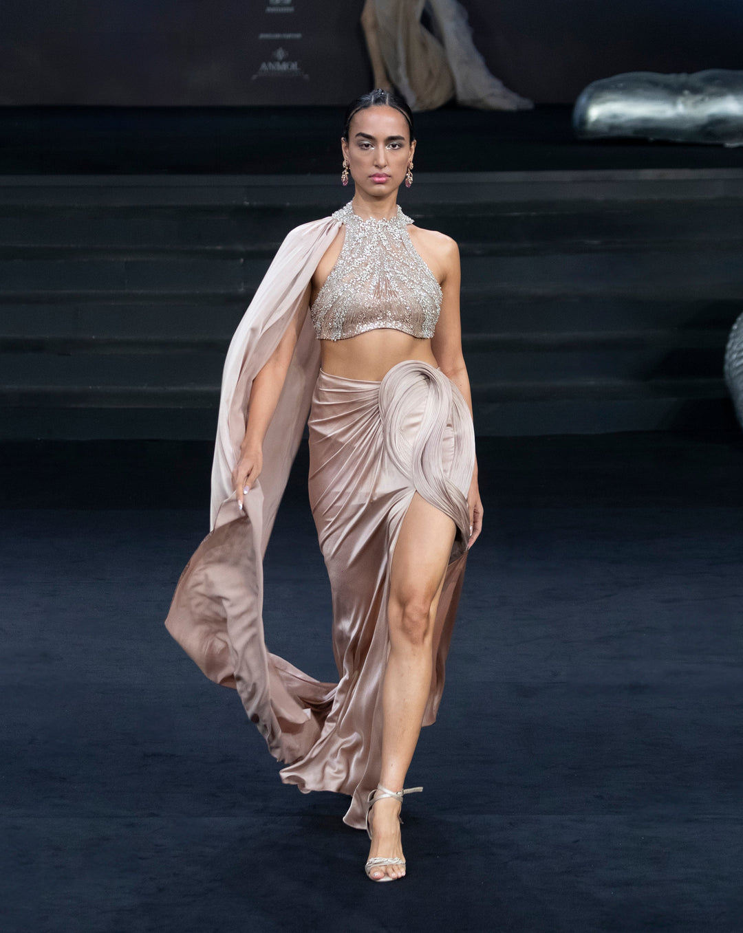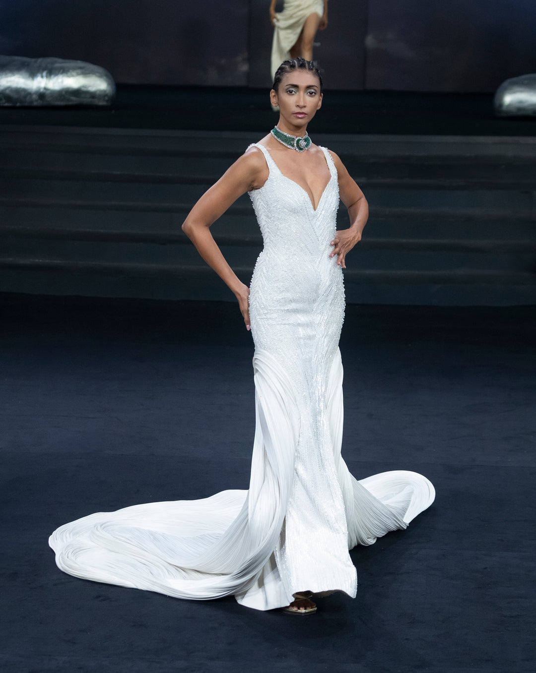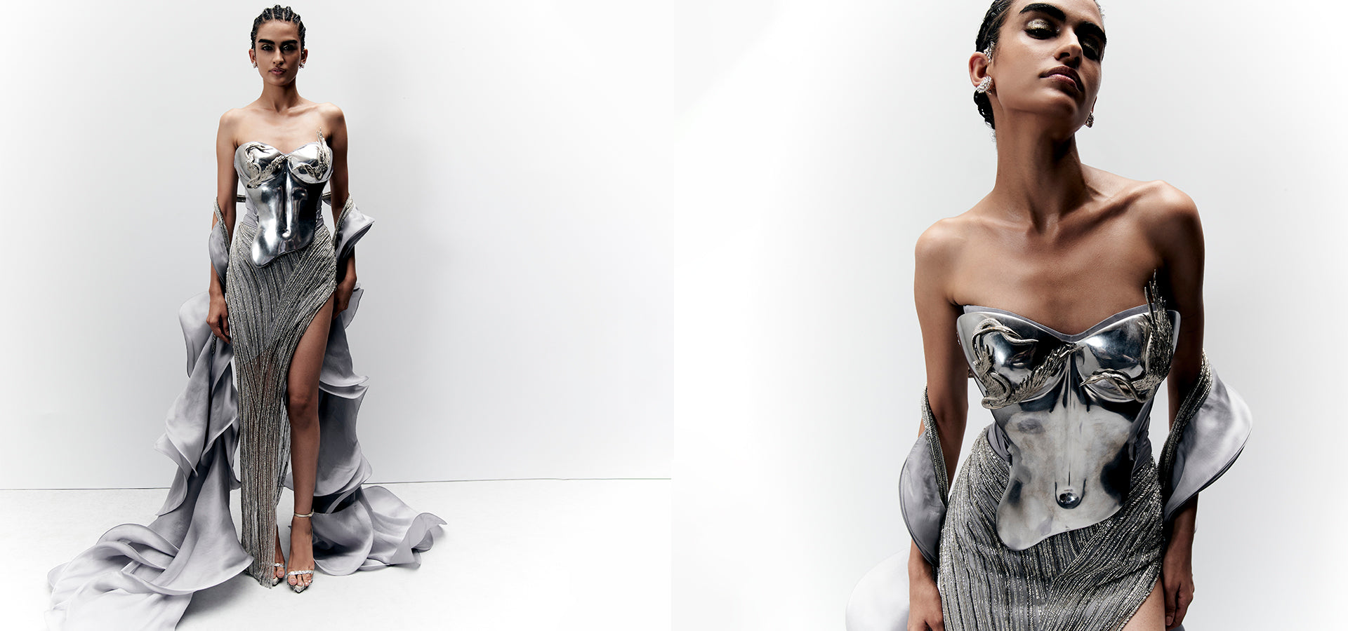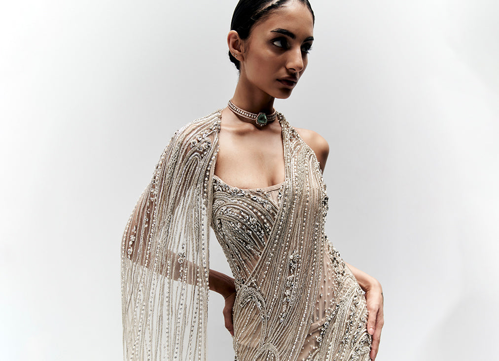 The Arunodaya collection captures the serene tones of early morning with White, Ivory Pearl, Comet Blue, Petal Pink, Mauve, Slate, Sand, Bordeaux, and Lava, blending tradition with innovation. Intricate embroideries, including Indian Zardozi, cage embroidery, and colourful details, bring the dawn narrative to life. Sheer fabrics evoke the lightness of dawn, while high-end couture pieces like opulent lehengas, saree gowns, and draped sarees showcase Gaurav Gupta's craftsmanship and innovative spirit. Futuristic elements such as metallic breastplates and reflective embroidery on men's jackets enhance the collection, heralding a new era in Indian couture. The couturier’s signature sculpting art meanders throughout the collection, heralding a new era in Indian couture.