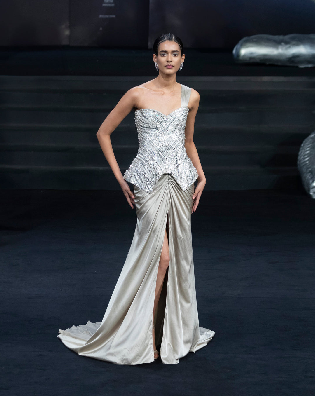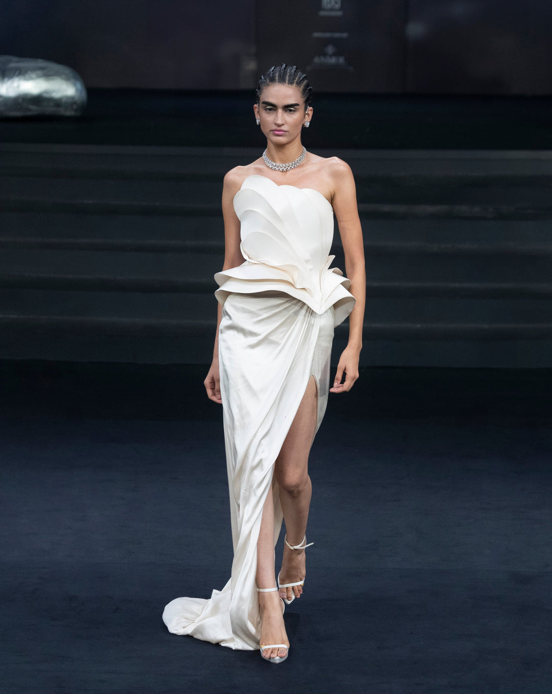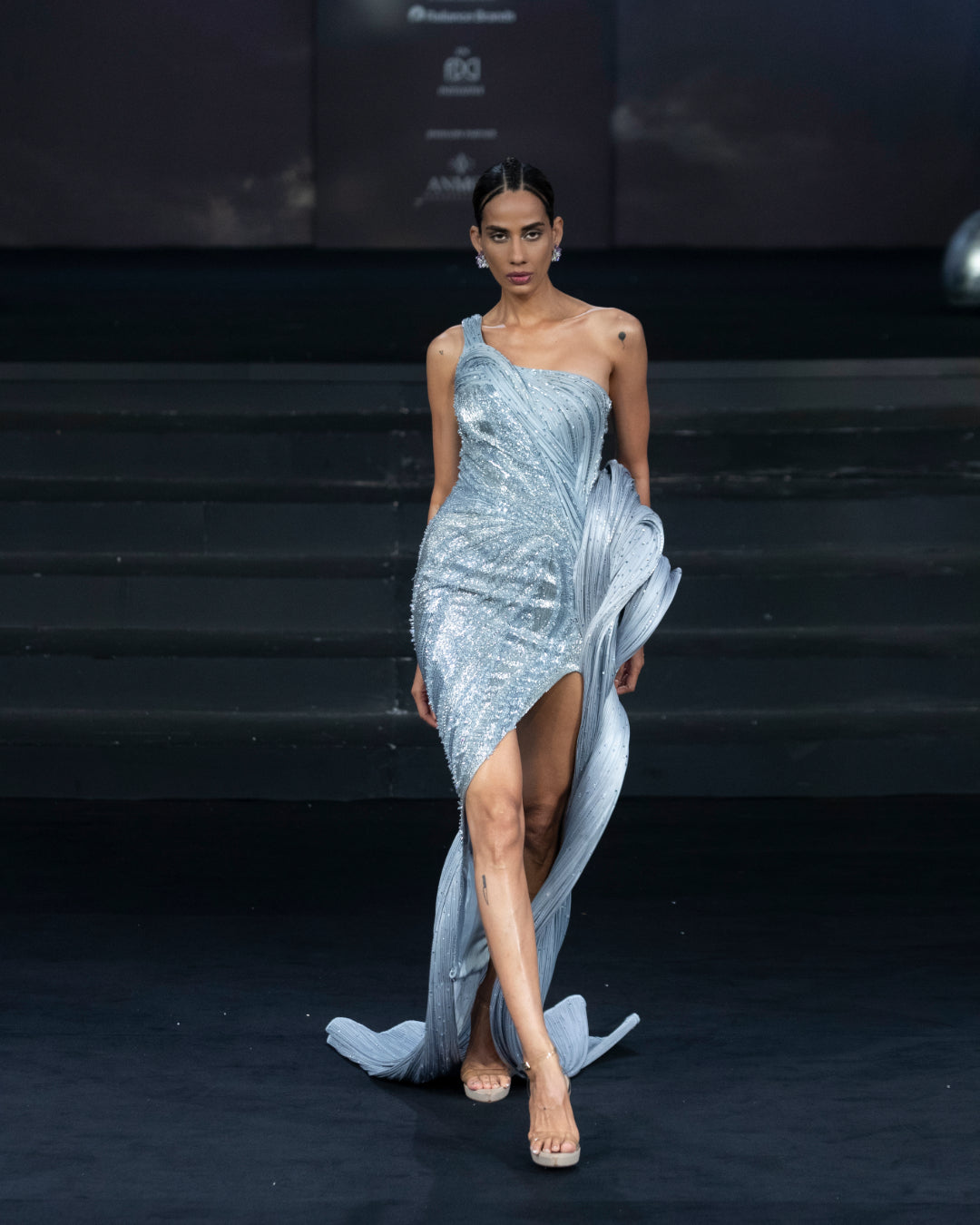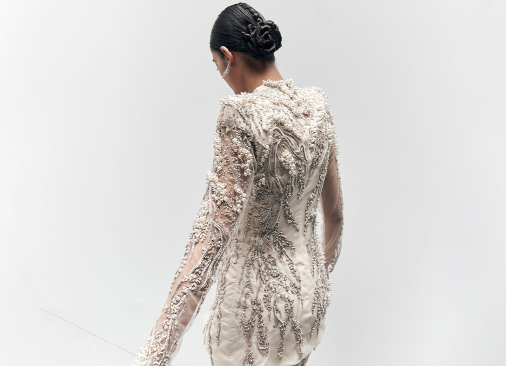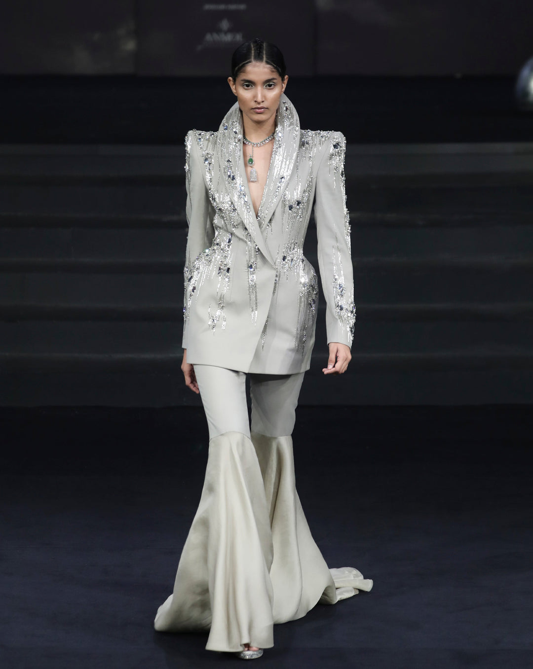 The Arunodaya collection captures the serene tones of early morning with White, Ivory Pearl, Comet Blue, Petal Pink, Mauve, Slate, Sand, Bordeaux, and Lava, blending tradition with innovation. Intricate embroideries, including Indian Zardozi, cage embroidery, and colourful details, bring the dawn narrative to life. Sheer fabrics evoke the lightness of dawn, while high-end couture pieces like opulent lehengas, saree gowns, and draped sarees showcase Gaurav Gupta's craftsmanship and innovative spirit. Futuristic elements such as metallic breastplates and reflective embroidery on men's jackets enhance the collection, heralding a new era in Indian couture. The couturier’s signature sculpting art meanders throughout the collection, heralding a new era in Indian couture.