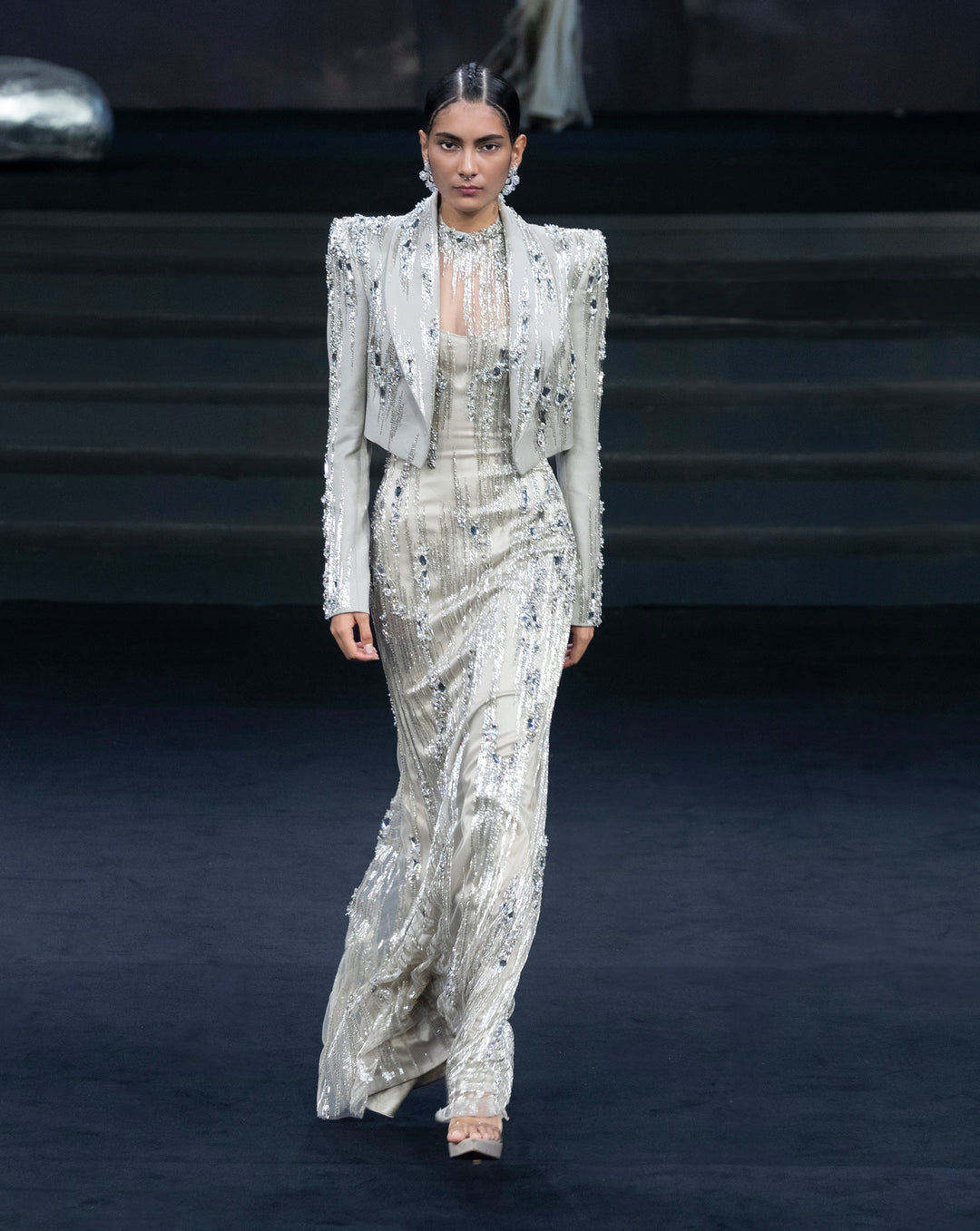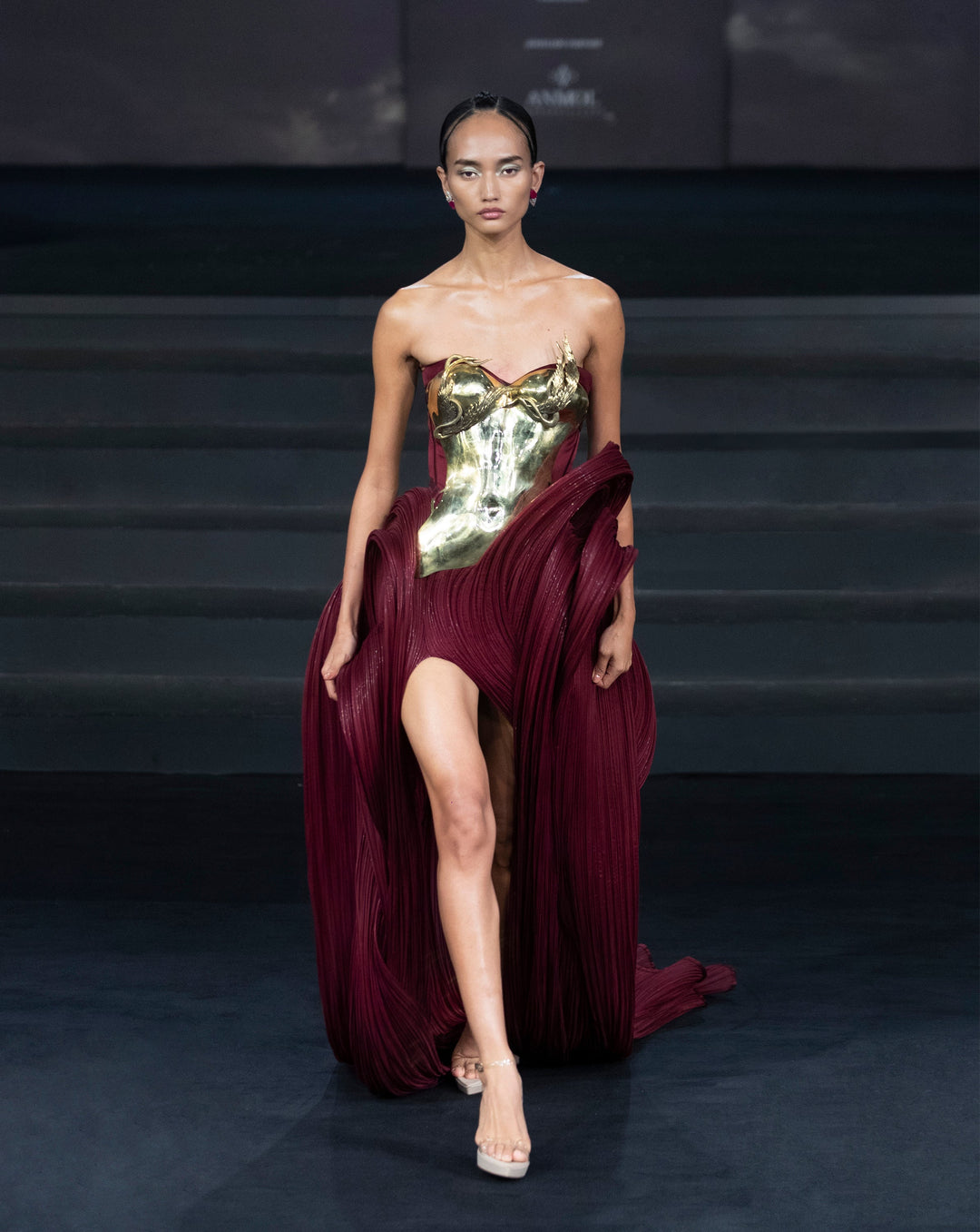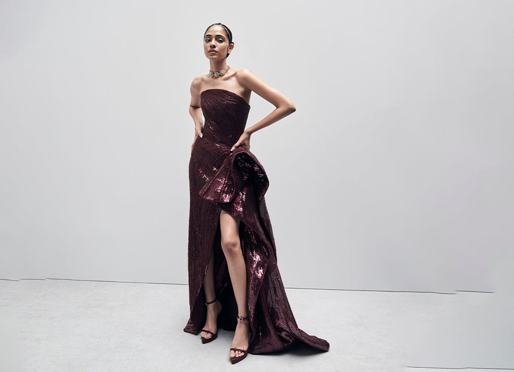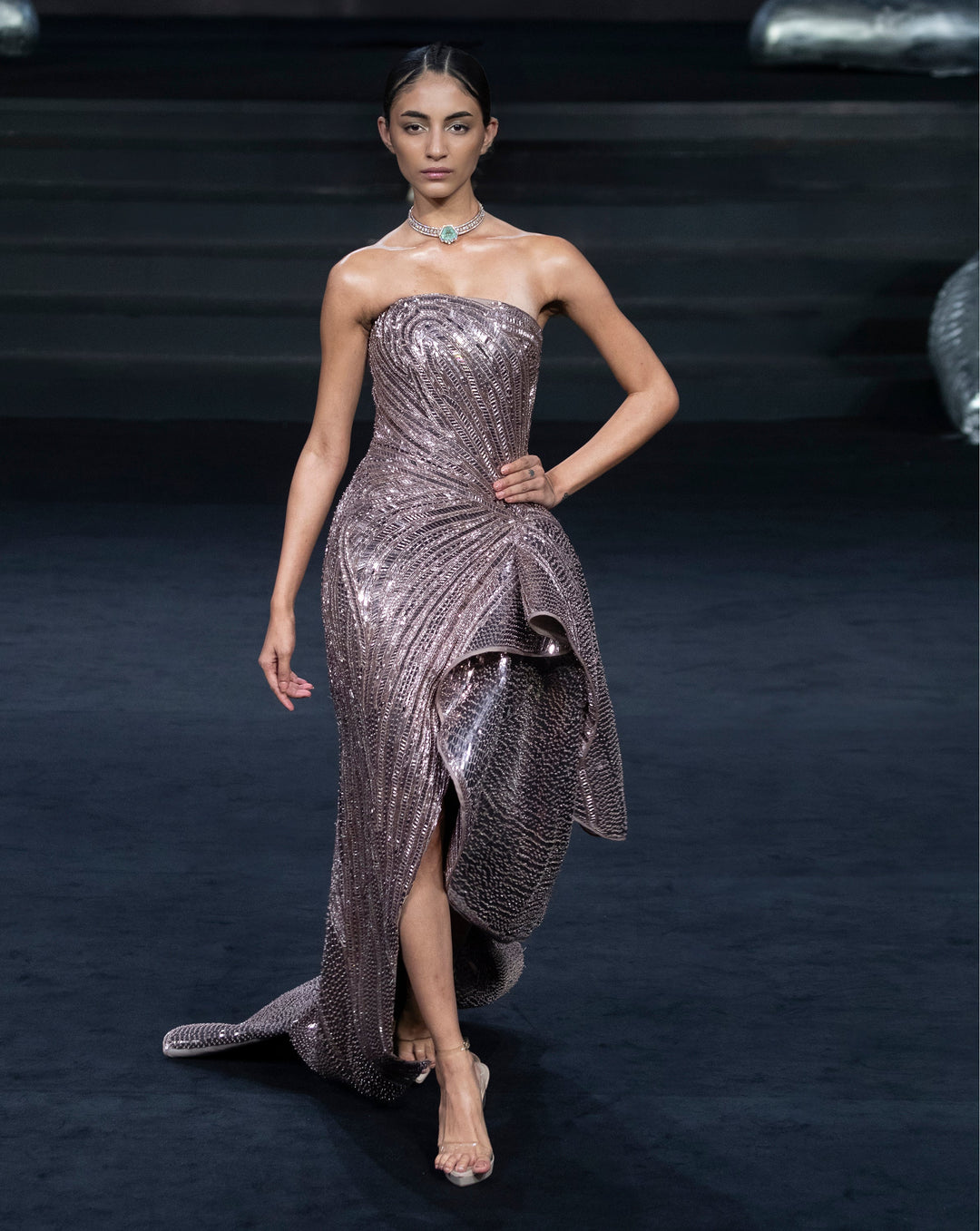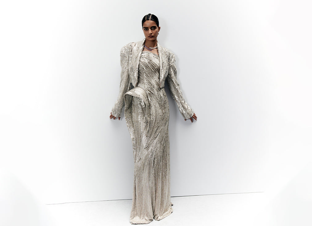 The Arunodaya collection captures the serene tones of early morning with White, Ivory Pearl, Comet Blue, Petal Pink, Mauve, Slate, Sand, Bordeaux, and Lava, blending tradition with innovation. Intricate embroideries, including Indian Zardozi, cage embroidery, and colourful details, bring the dawn narrative to life. Sheer fabrics evoke the lightness of dawn, while high-end couture pieces like opulent lehengas, saree gowns, and draped sarees showcase Gaurav Gupta's craftsmanship and innovative spirit. Futuristic elements such as metallic breastplates and reflective embroidery on men's jackets enhance the collection, heralding a new era in Indian couture. The couturier’s signature sculpting art meanders throughout the collection, heralding a new era in Indian couture.