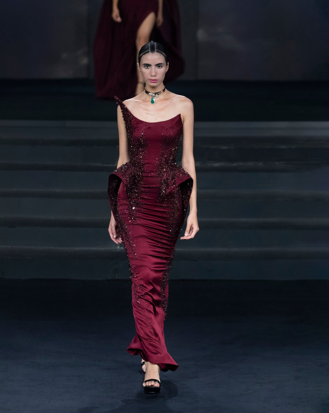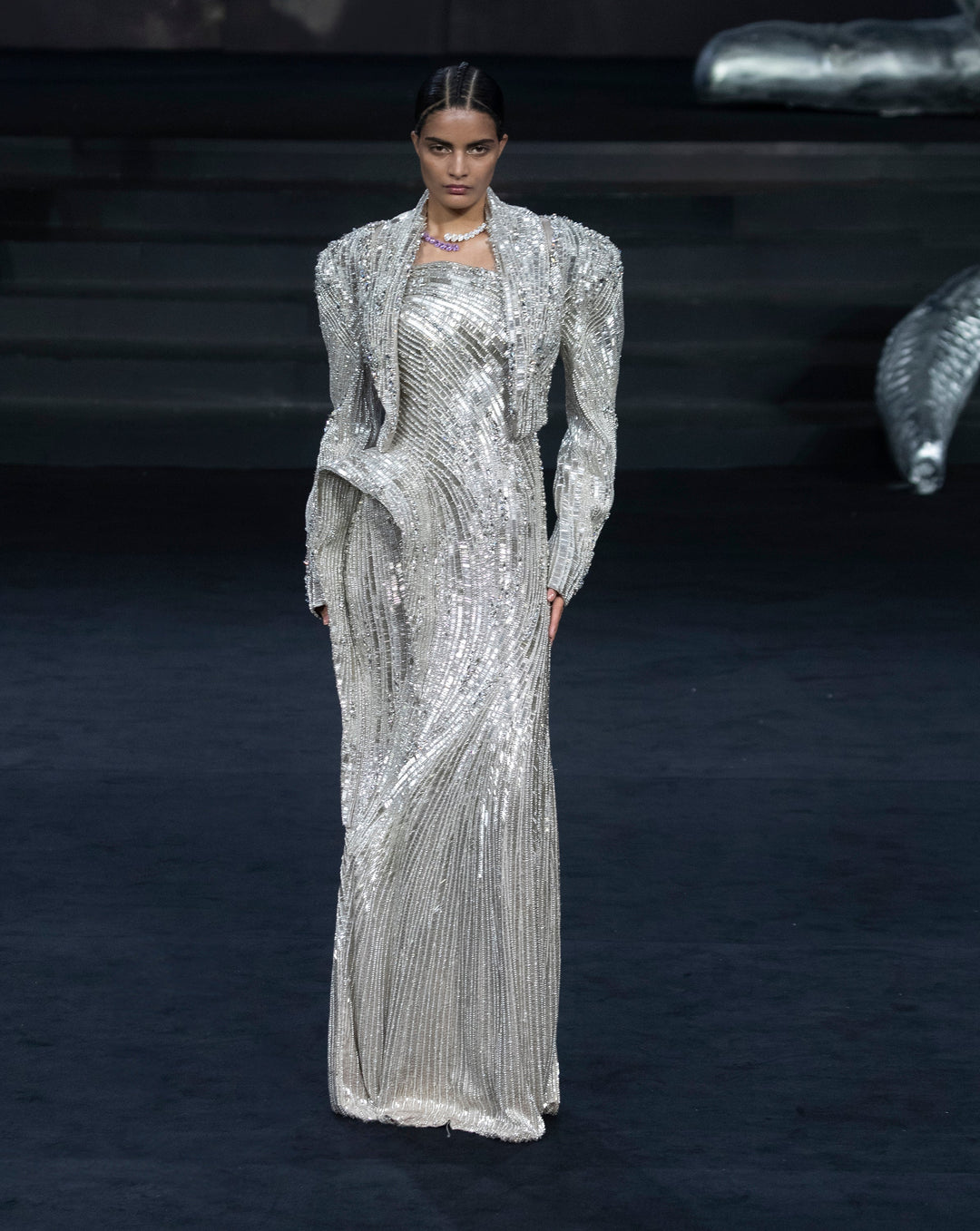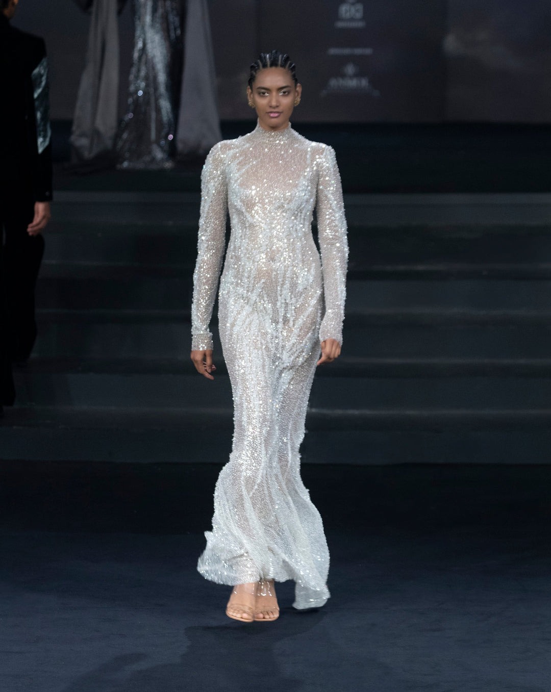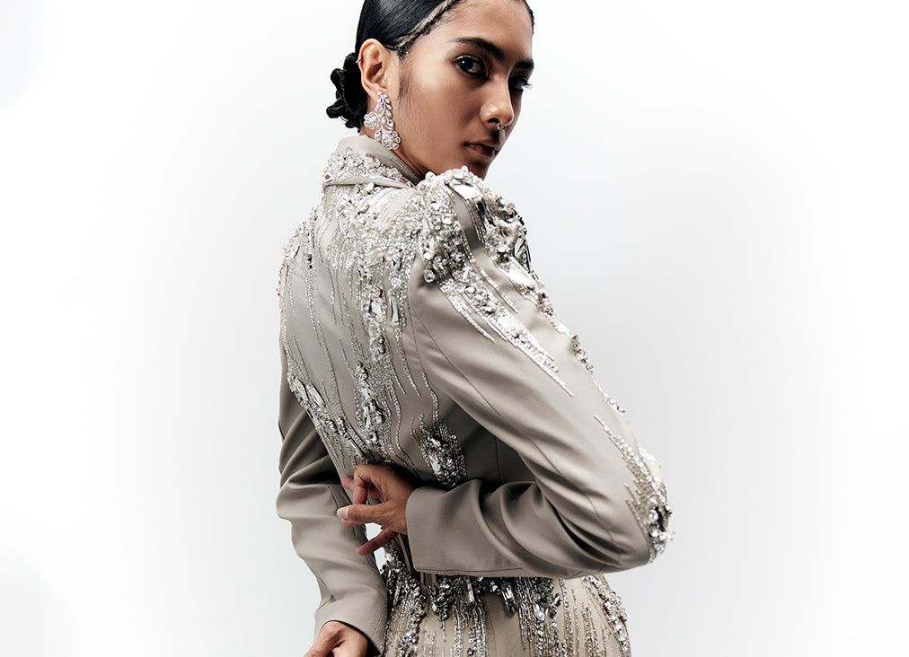 The Arunodaya collection captures the serene tones of early morning with White, Ivory Pearl, Comet Blue, Petal Pink, Mauve, Slate, Sand, Bordeaux, and Lava, blending tradition with innovation. Intricate embroideries, including Indian Zardozi, cage embroidery, and colourful details, bring the dawn narrative to life. Sheer fabrics evoke the lightness of dawn, while high-end couture pieces like opulent lehengas, saree gowns, and draped sarees showcase Gaurav Gupta's craftsmanship and innovative spirit. Futuristic elements such as metallic breastplates and reflective embroidery on men's jackets enhance the collection, heralding a new era in Indian couture. The couturier’s signature sculpting art meanders throughout the collection, heralding a new era in Indian couture.