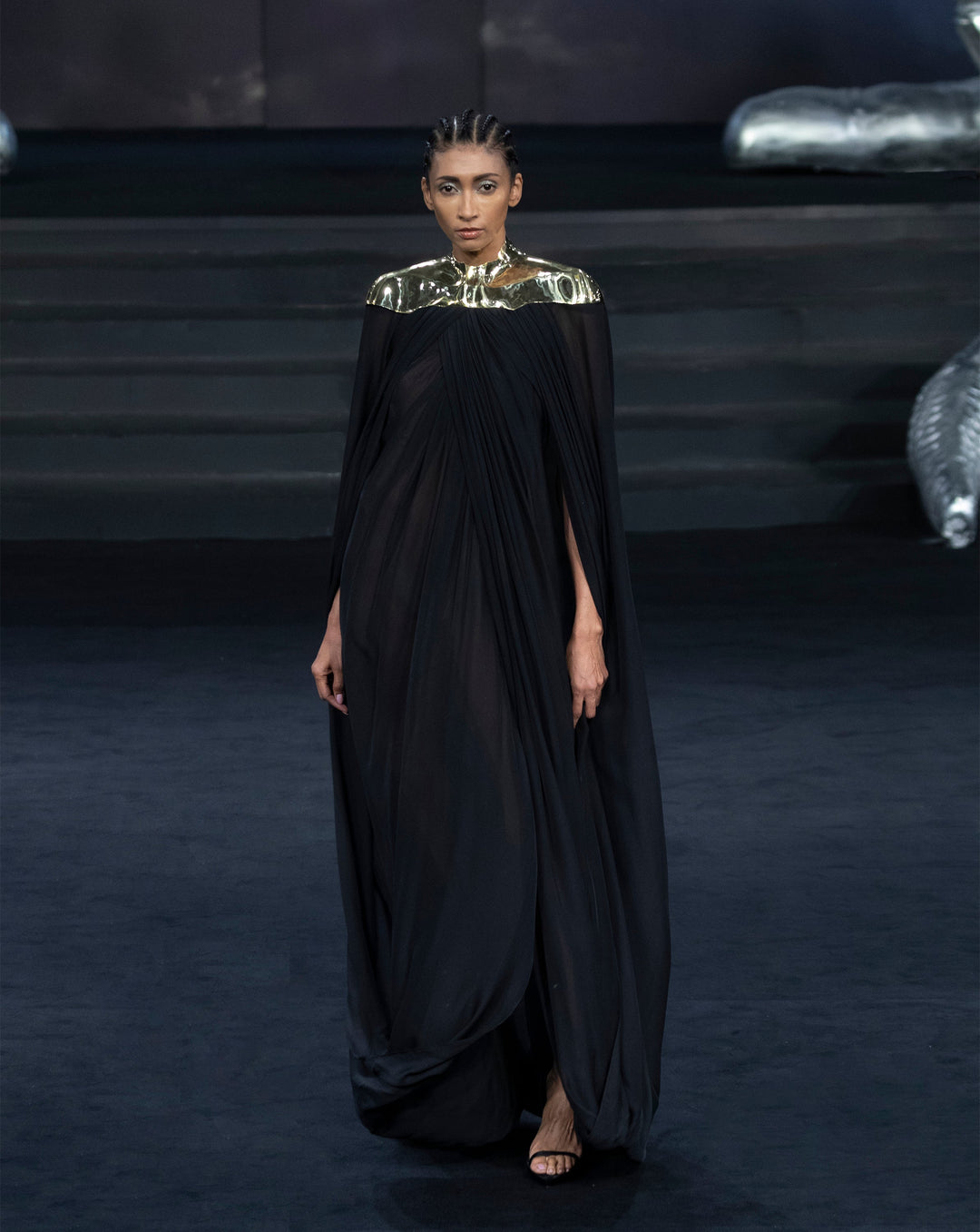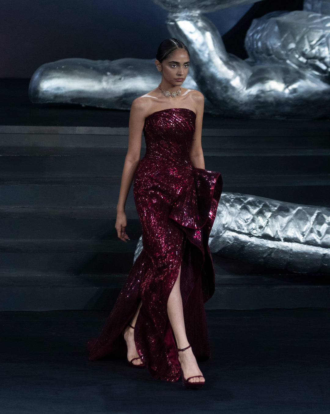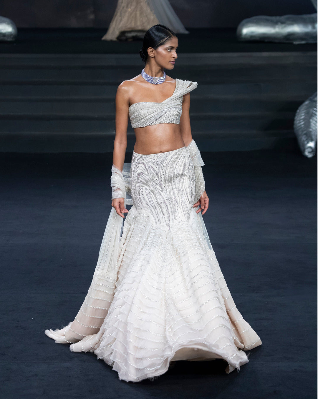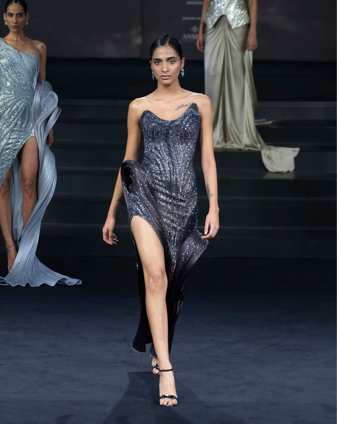 Arunodaya signifies the early dawn, derived from the Sanskrit words "Arun," meaning dawn, and "Udaya," meaning riser daybreak. This captivating phenomenon, where the first light of day breaks the darkness, is the essence of Gaurav Gupta's India couture collection. Arunodaya embodies the mystical transformation of night into day, symbolising hope, renewal, and the infinite possibilities that come with each new beginning.
