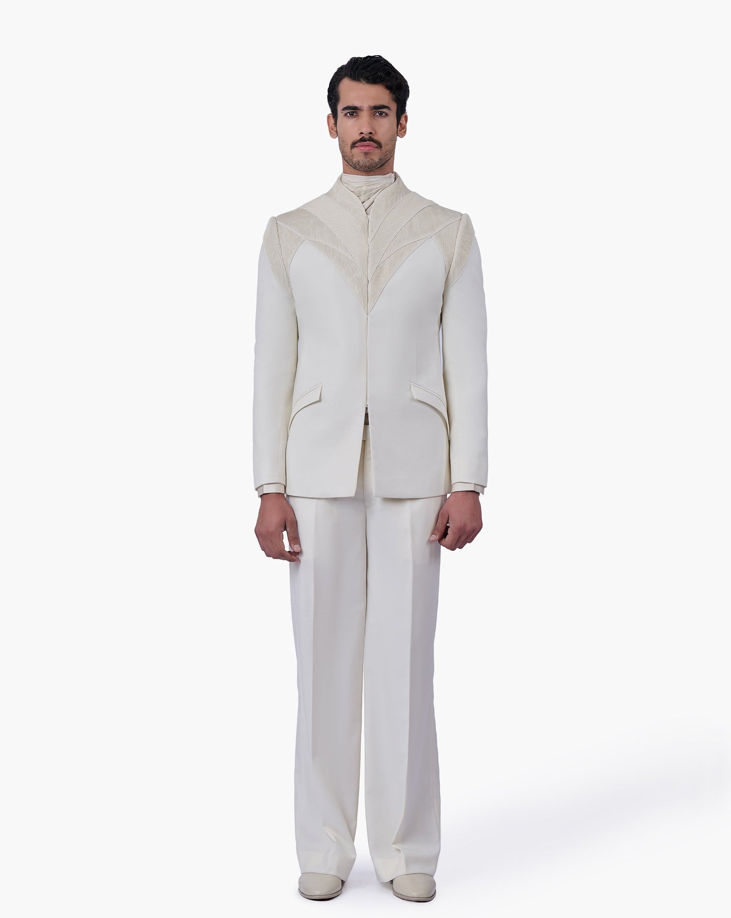 Ecru bandhgala featuring an architectural pintuck construction with a sculpted, structured silhouette and precise linear detailing.