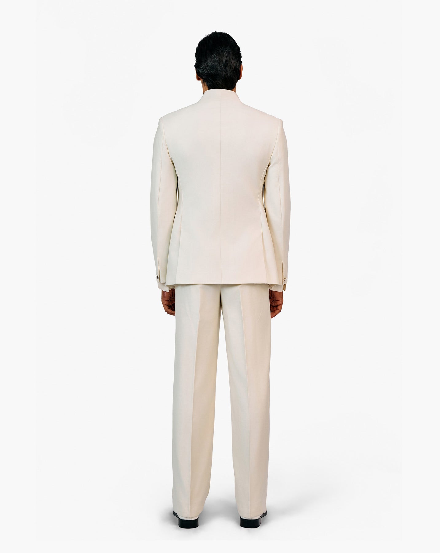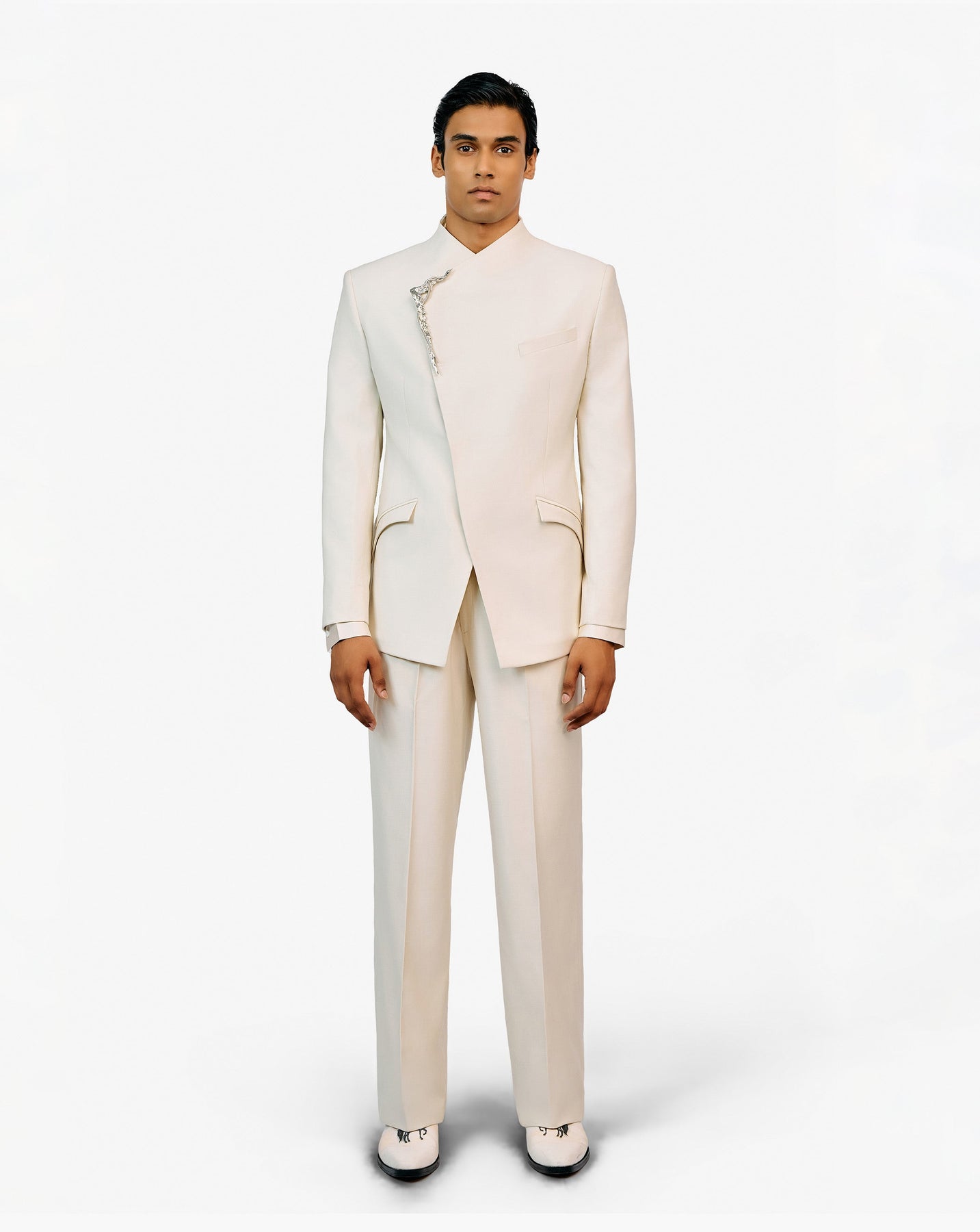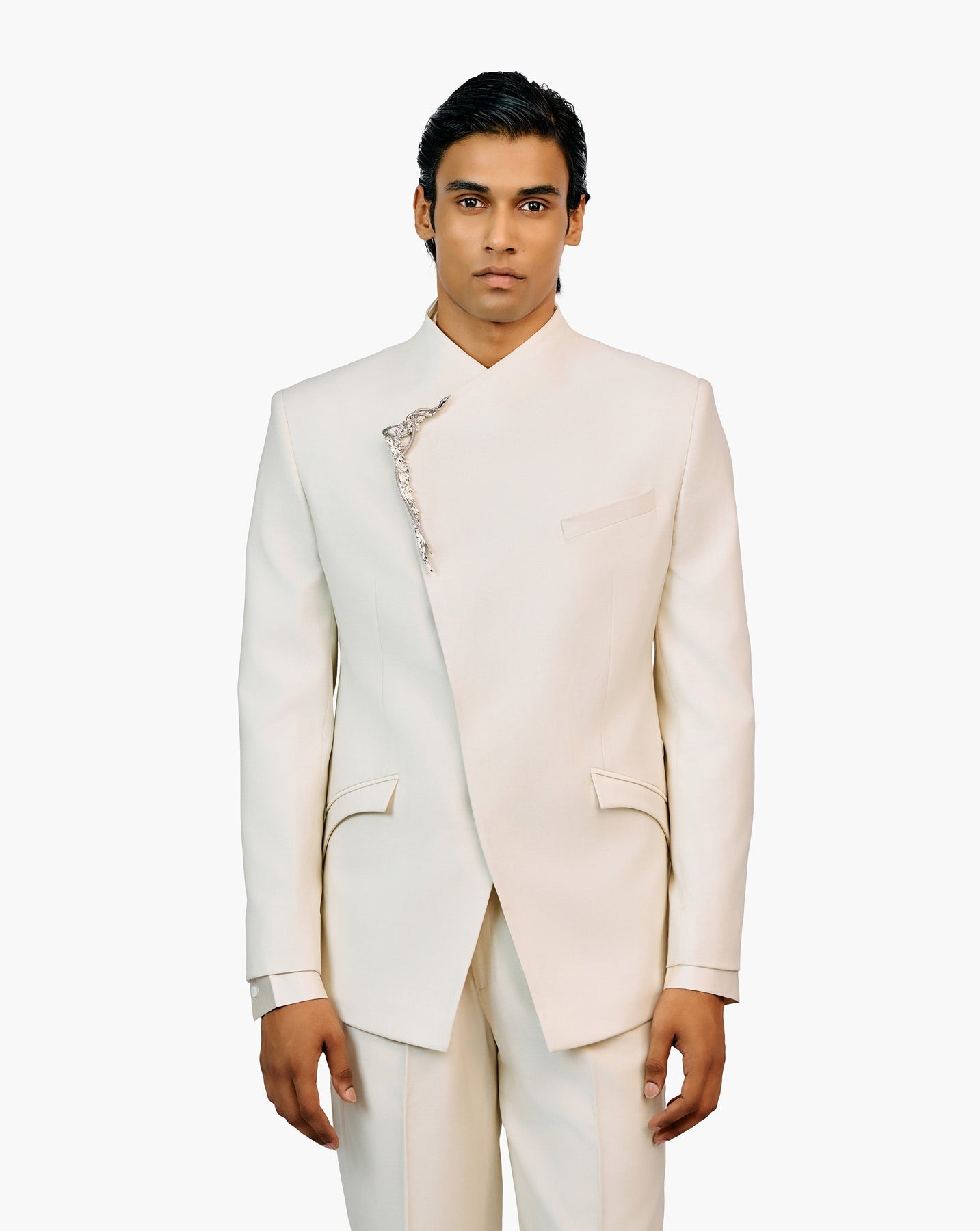 Ecru bandhgala with metallic brooch detailing.