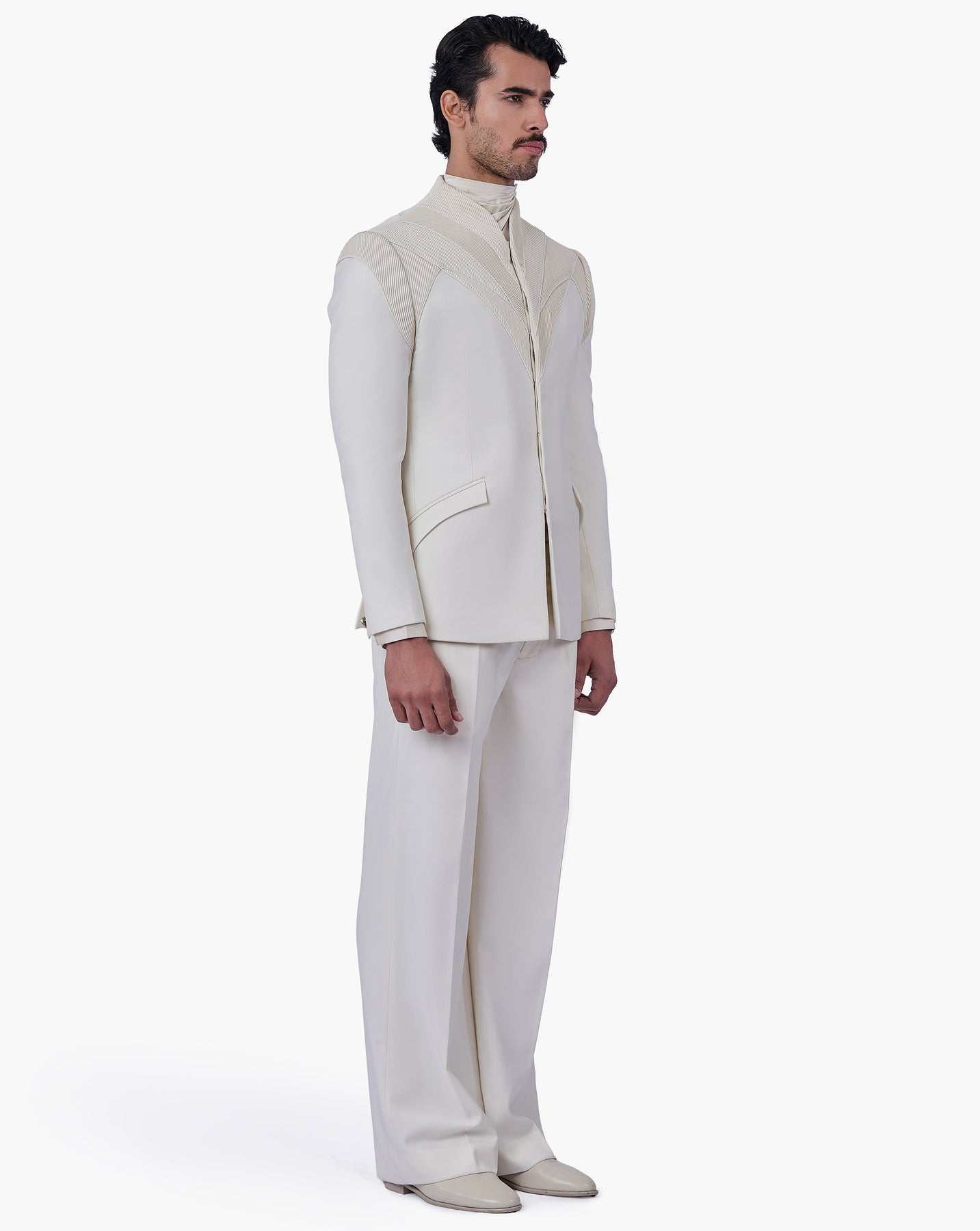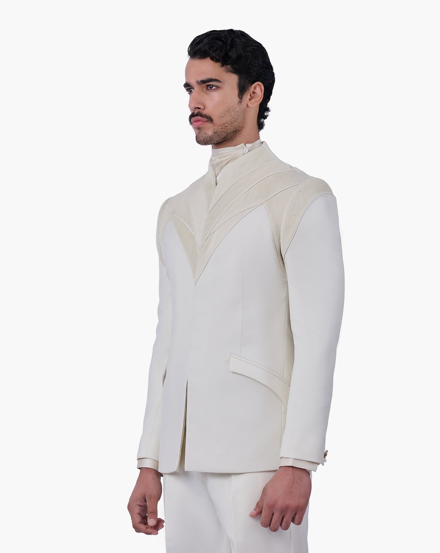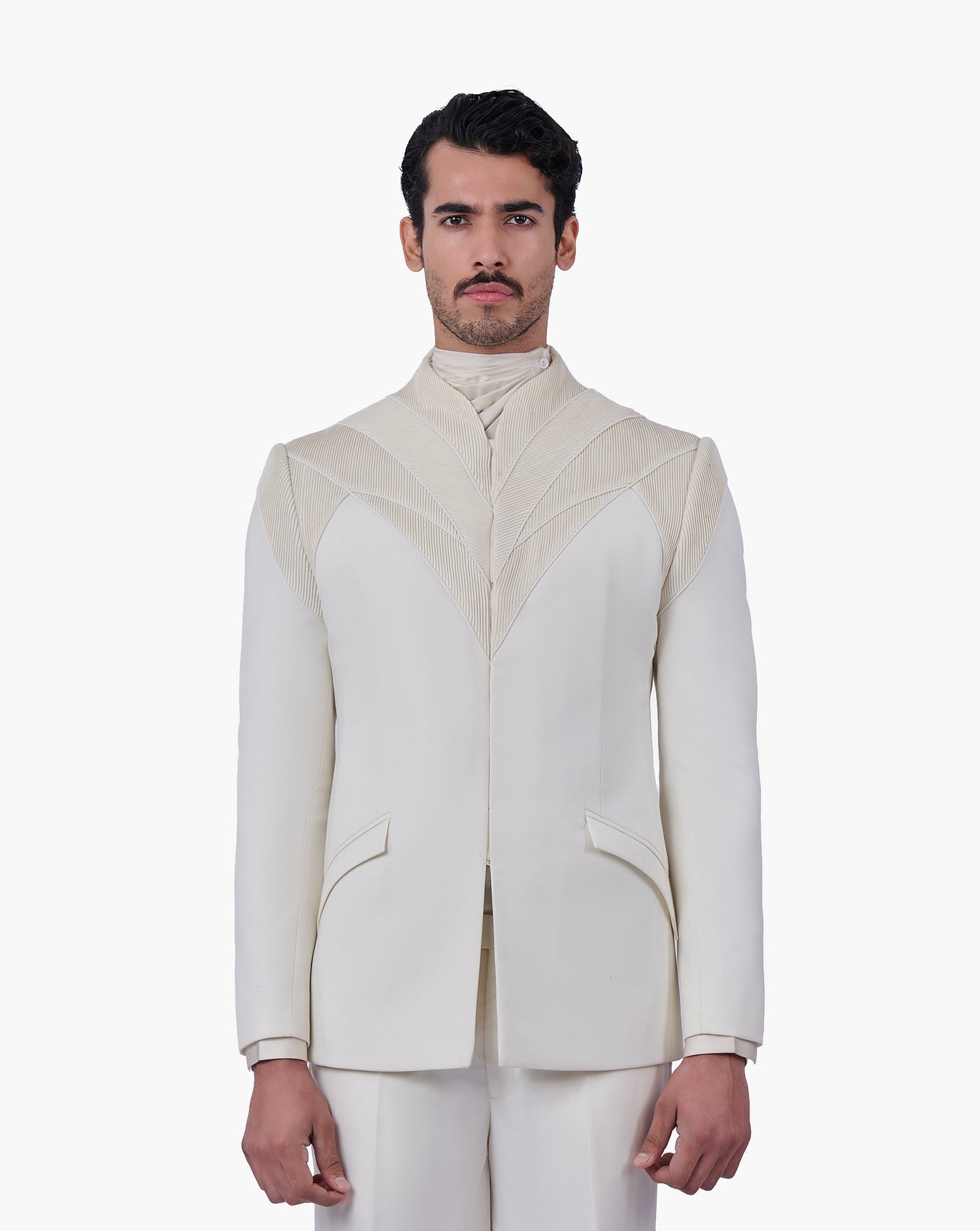 Ecru bandhgala featuring an architectural pintuck construction with a sculpted, structured silhouette and precise linear detailing.