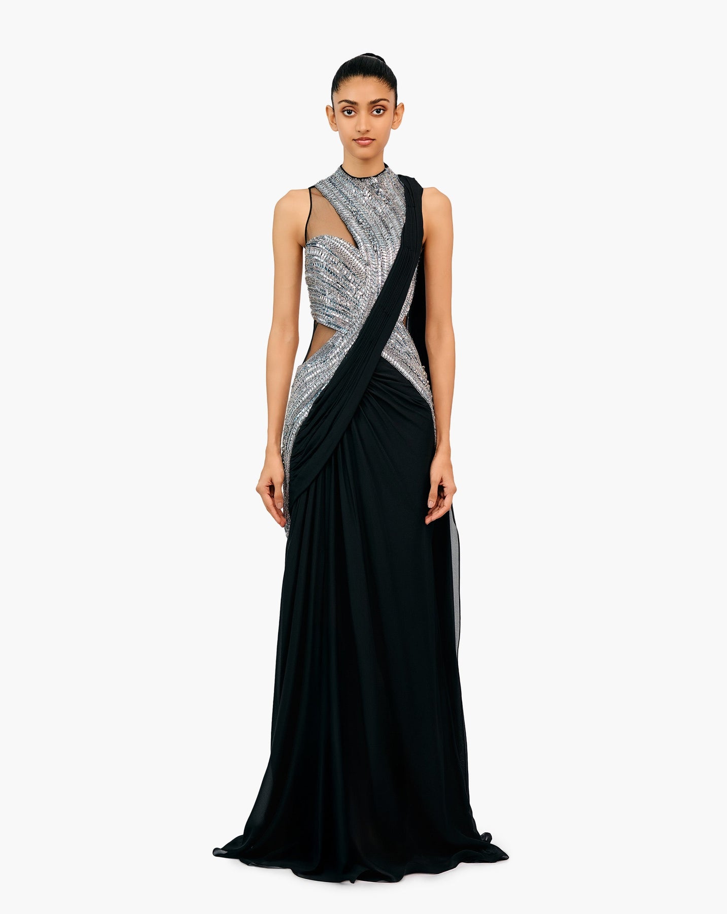 Black saree gown with house signature refraction embroidery and a statement side slit.
