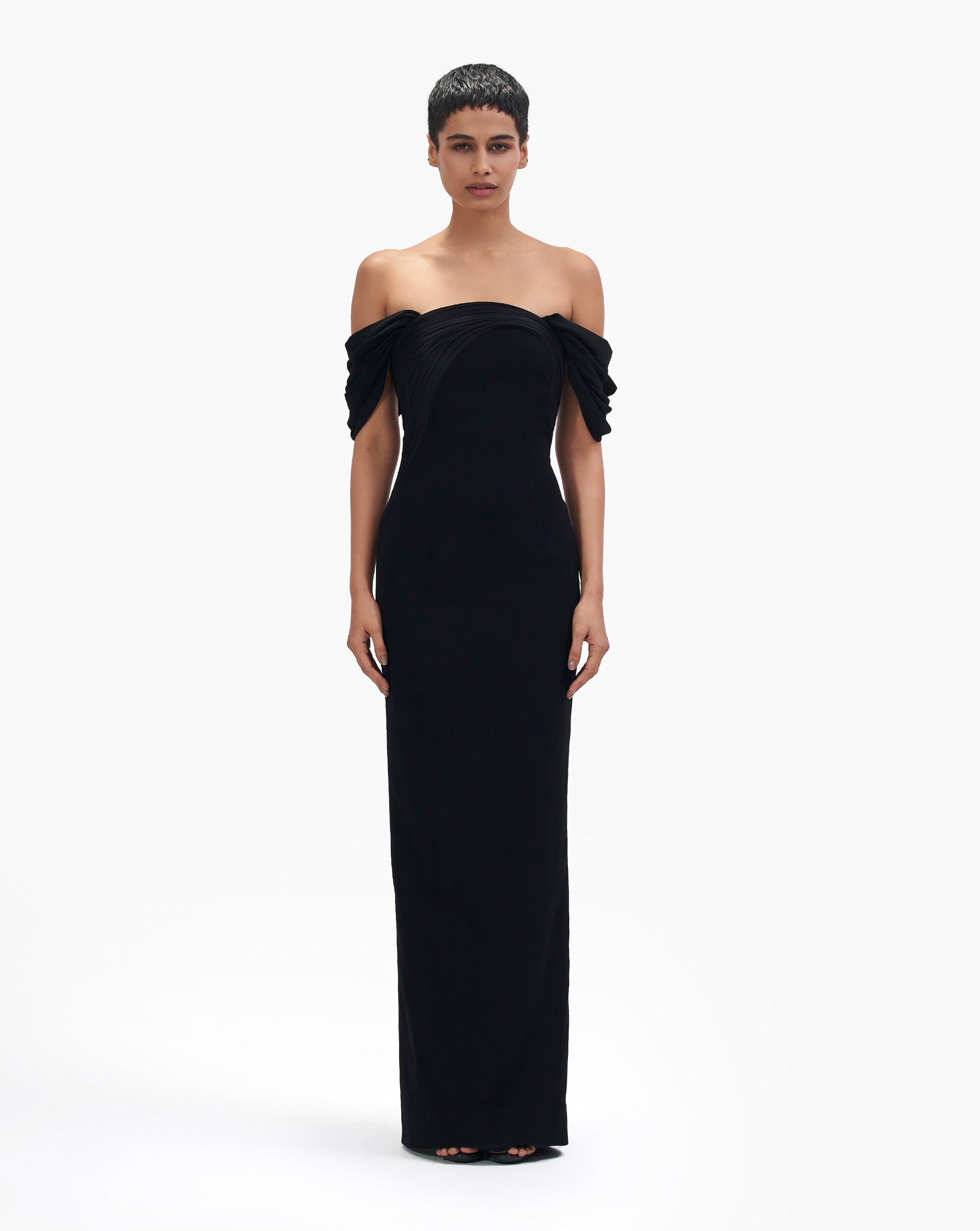 Off shoulder column gown in black crepe, with a draped sleeve and a sculpted neckline.