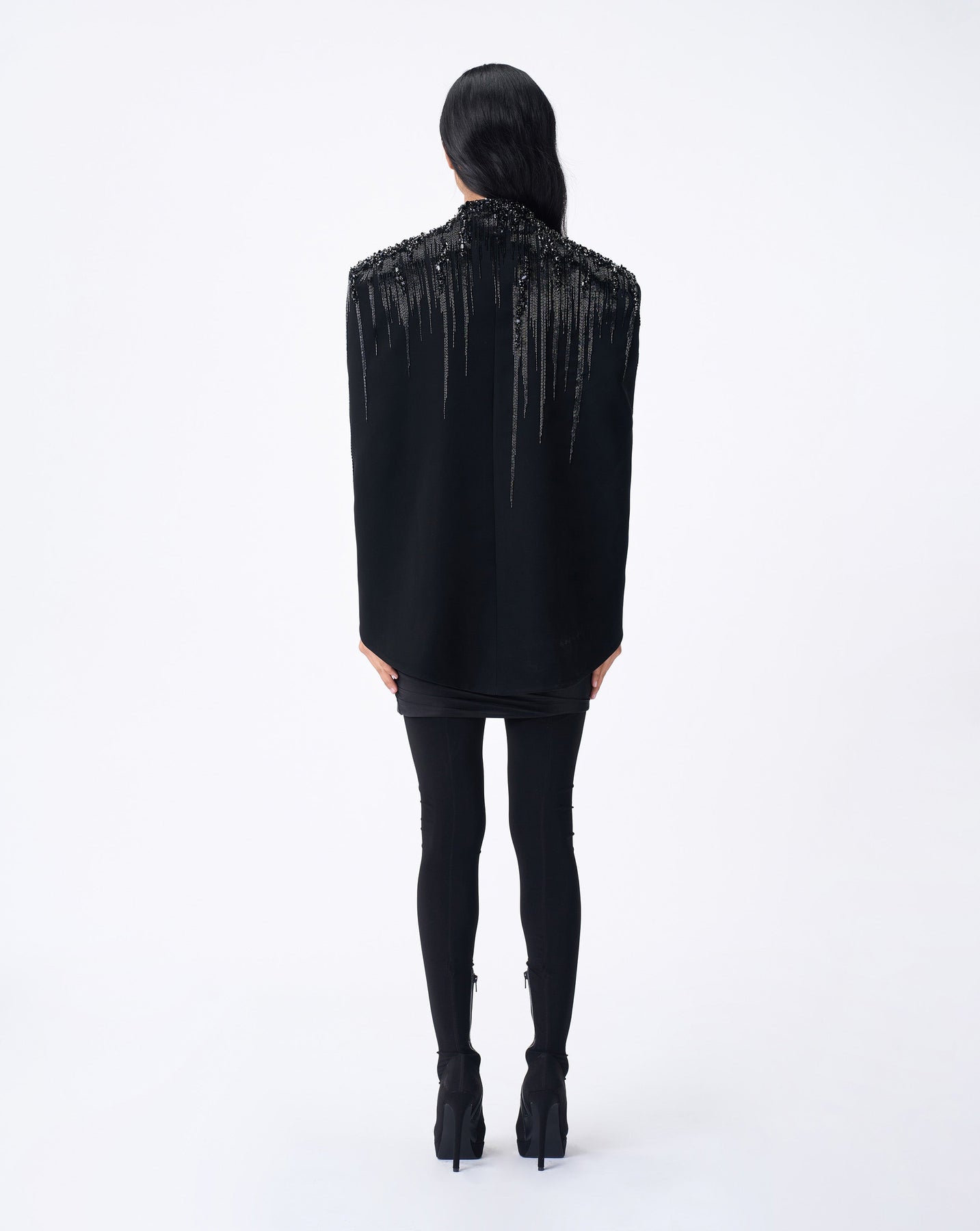 Black Lightfall-Embroidered Cape Encrusted with Crystals and Bugle Beads