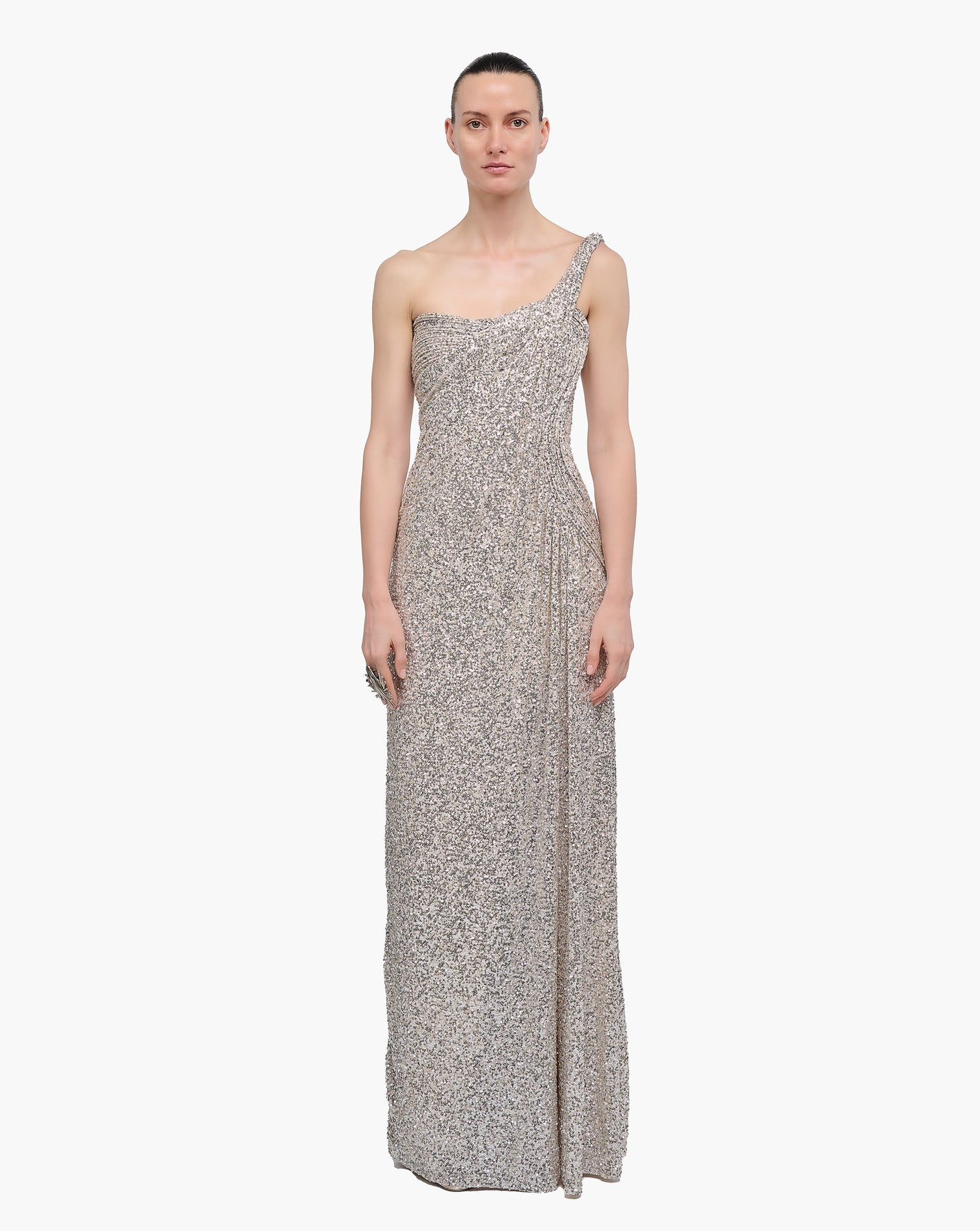 A white-gold one-shoulder draped gown in moondust sequins.