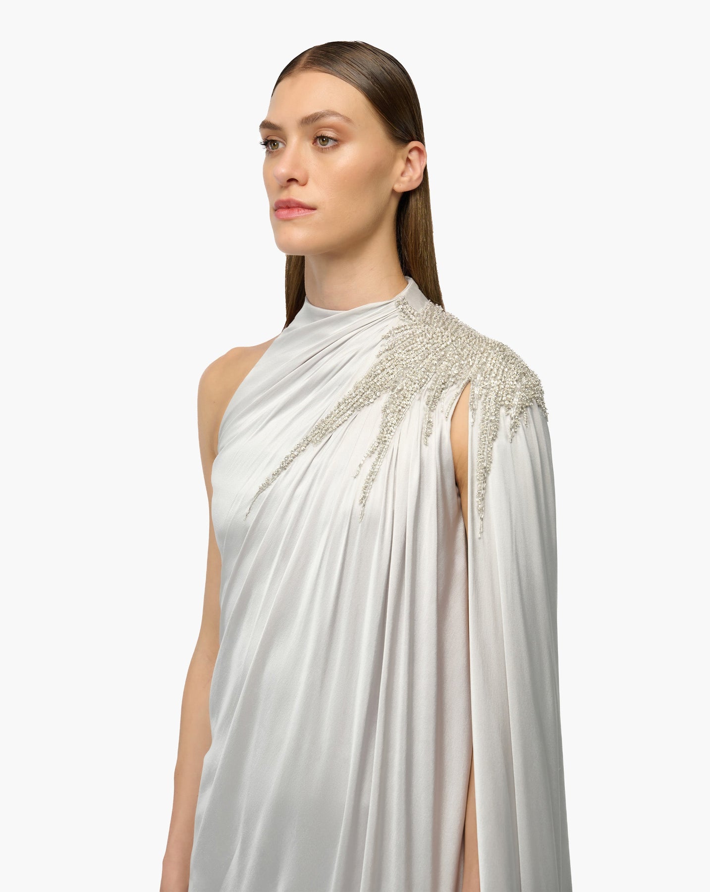 Silver ash one-shoulder kaftan with gathered drape and crystal embroidery.