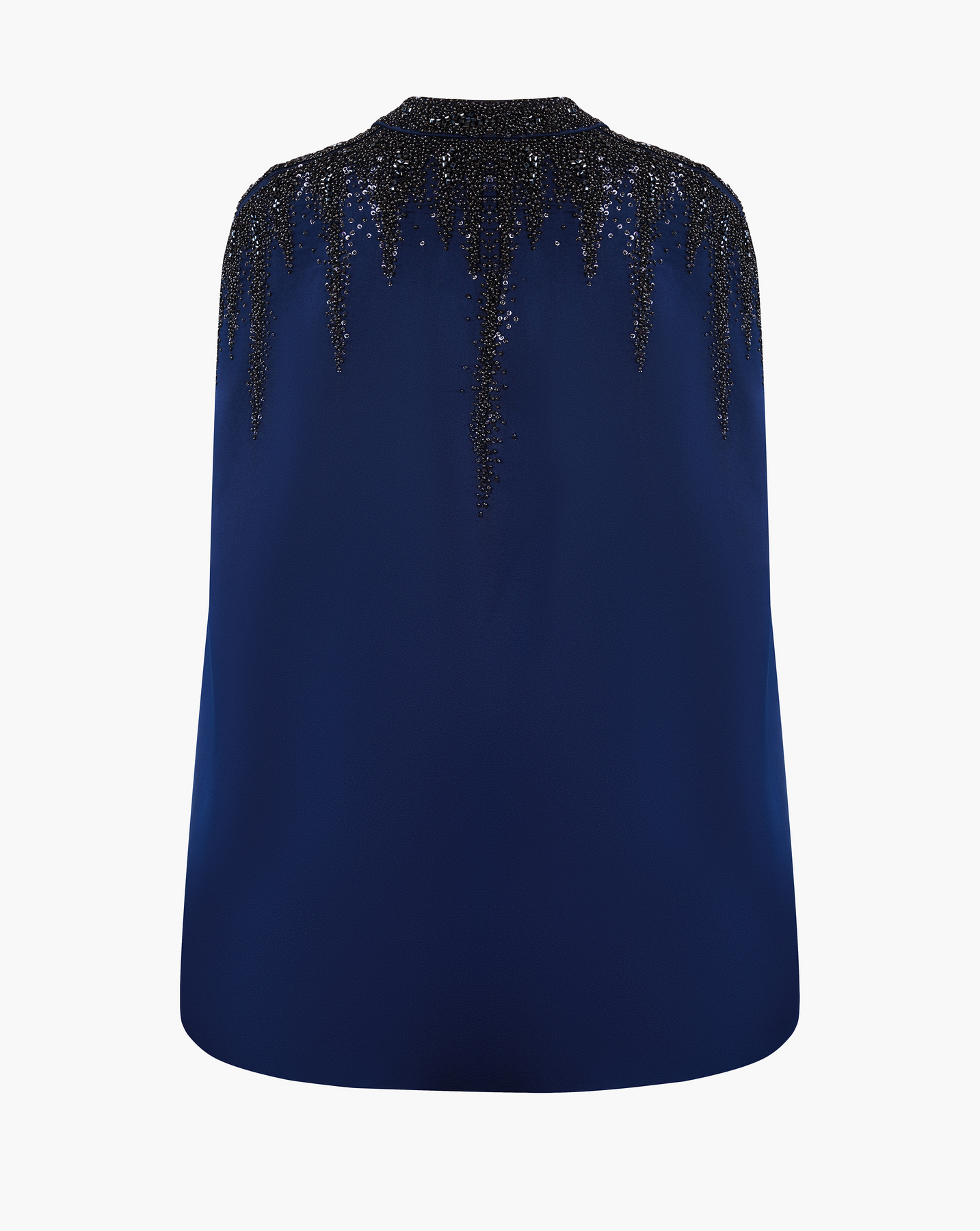 Night Blue tailored cape with bugle bead embroidery.