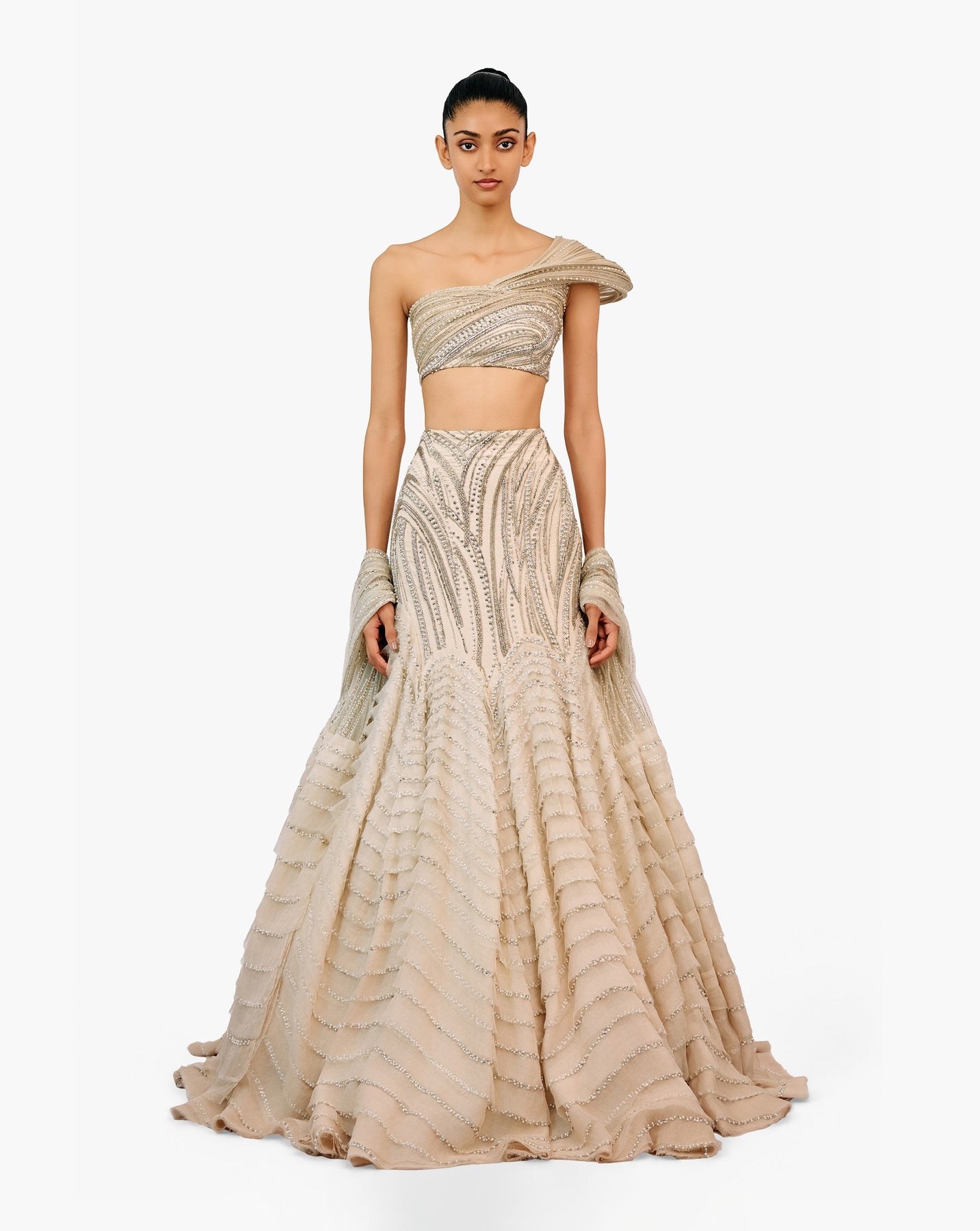 Pearl lehenga with tonal sequin embroidery and sculptural cut-out blouse.
