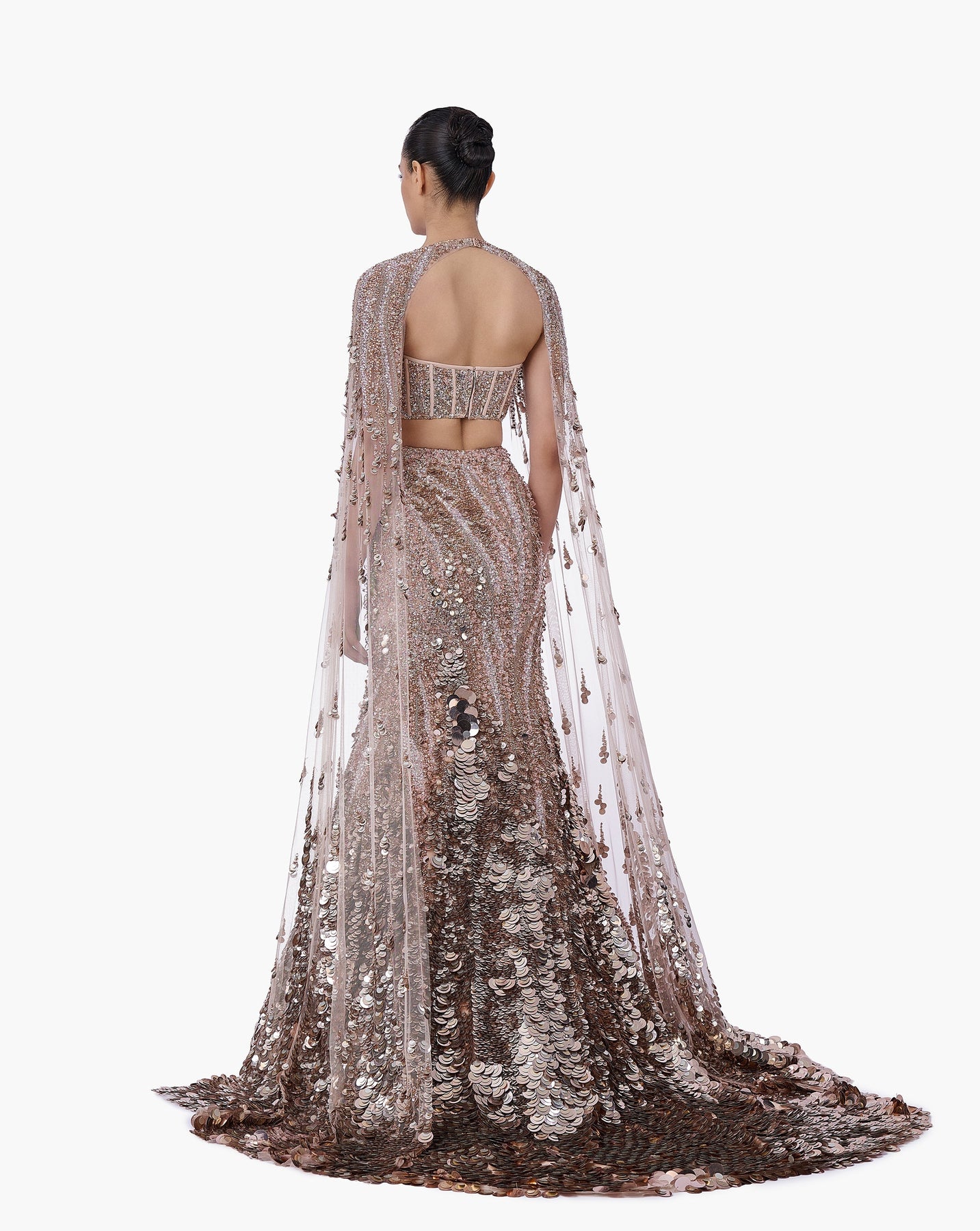 Crystallised scale–embroidered mermaid gown featuring a structured corset bustier with an attached sheer cape.