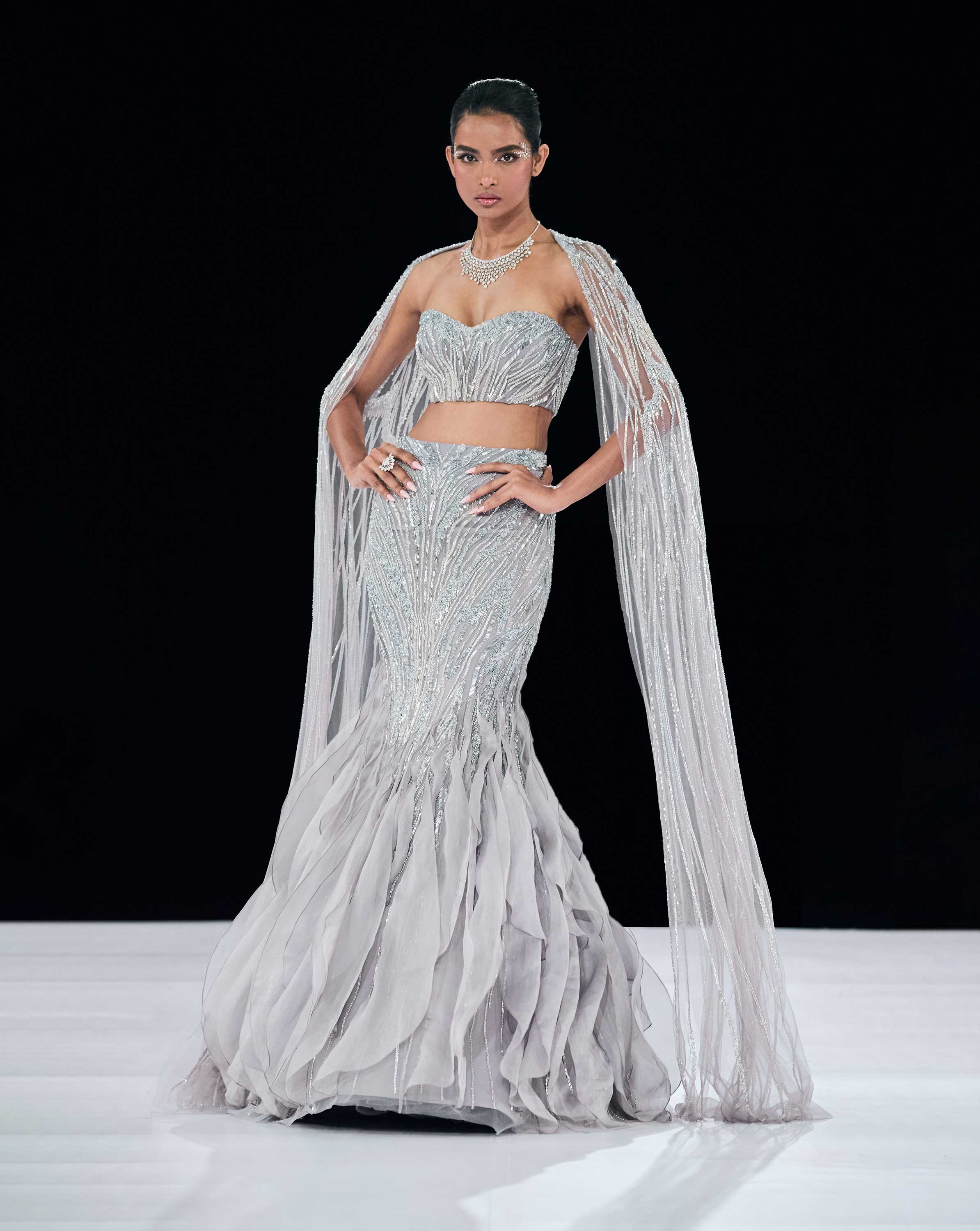 Named after the warrior constellation, this lehenga is a celestial storm. Featuring a crystallised corset with anatomical bugle bead embroidery and a soft ruffled bottom, the lehenga is paired alongside an embellished cape.