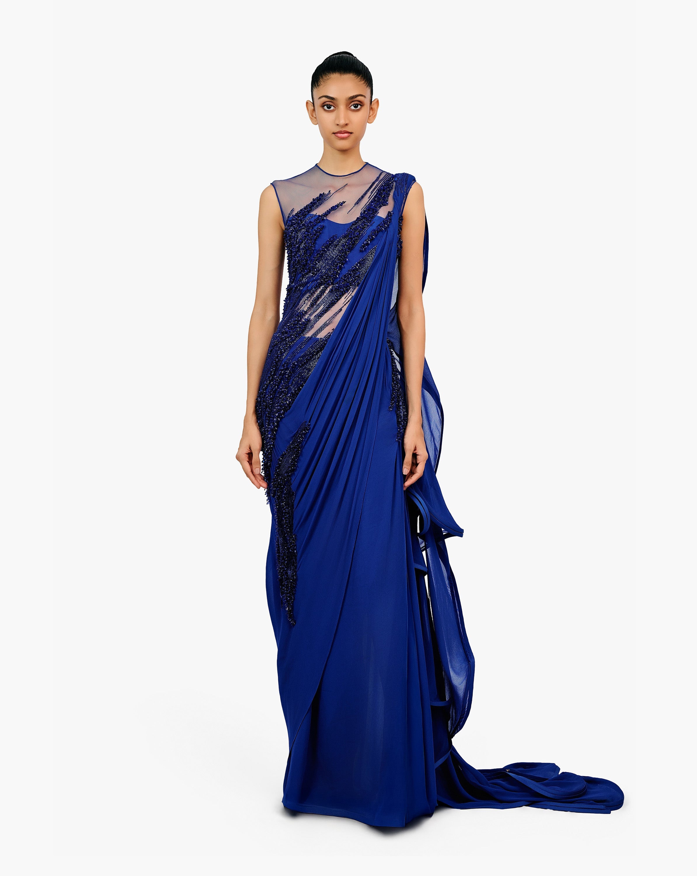 Electric blue side slit saree gown with a ruffled back drape and intricate crystal embroidery.