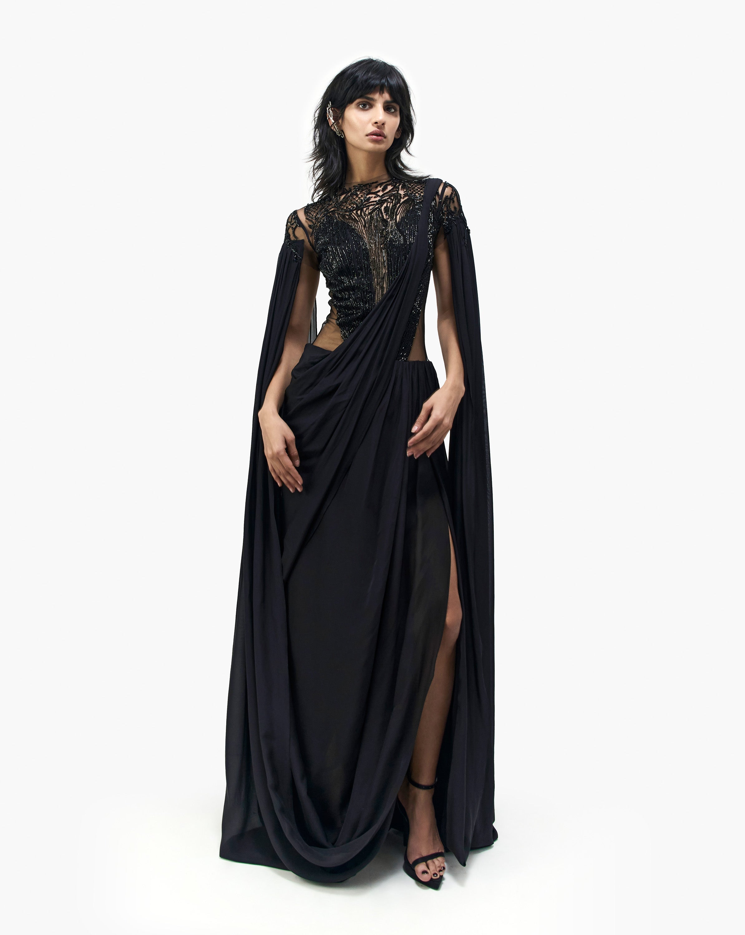 Black saree gown with intricate buggle beads and statement drape sleeves.