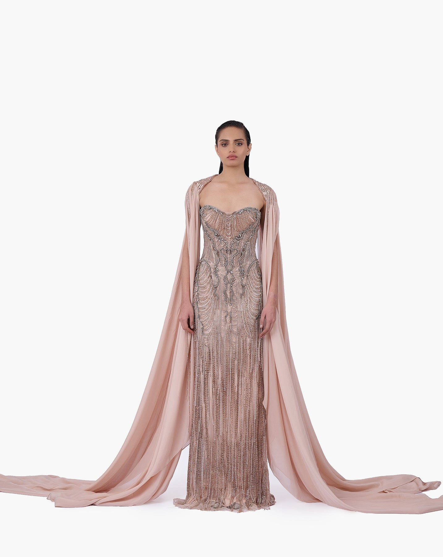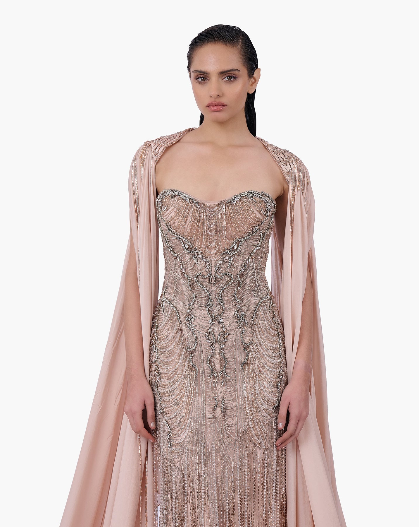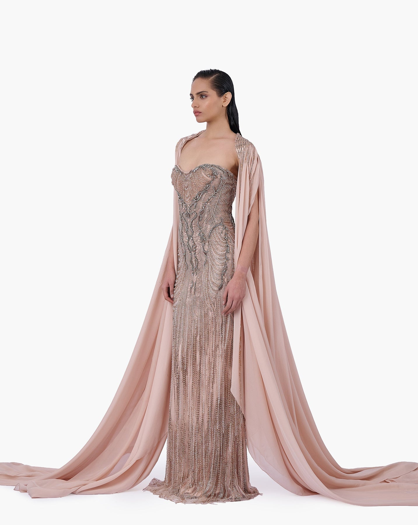 Light champagne cape featuring an elongated drape.