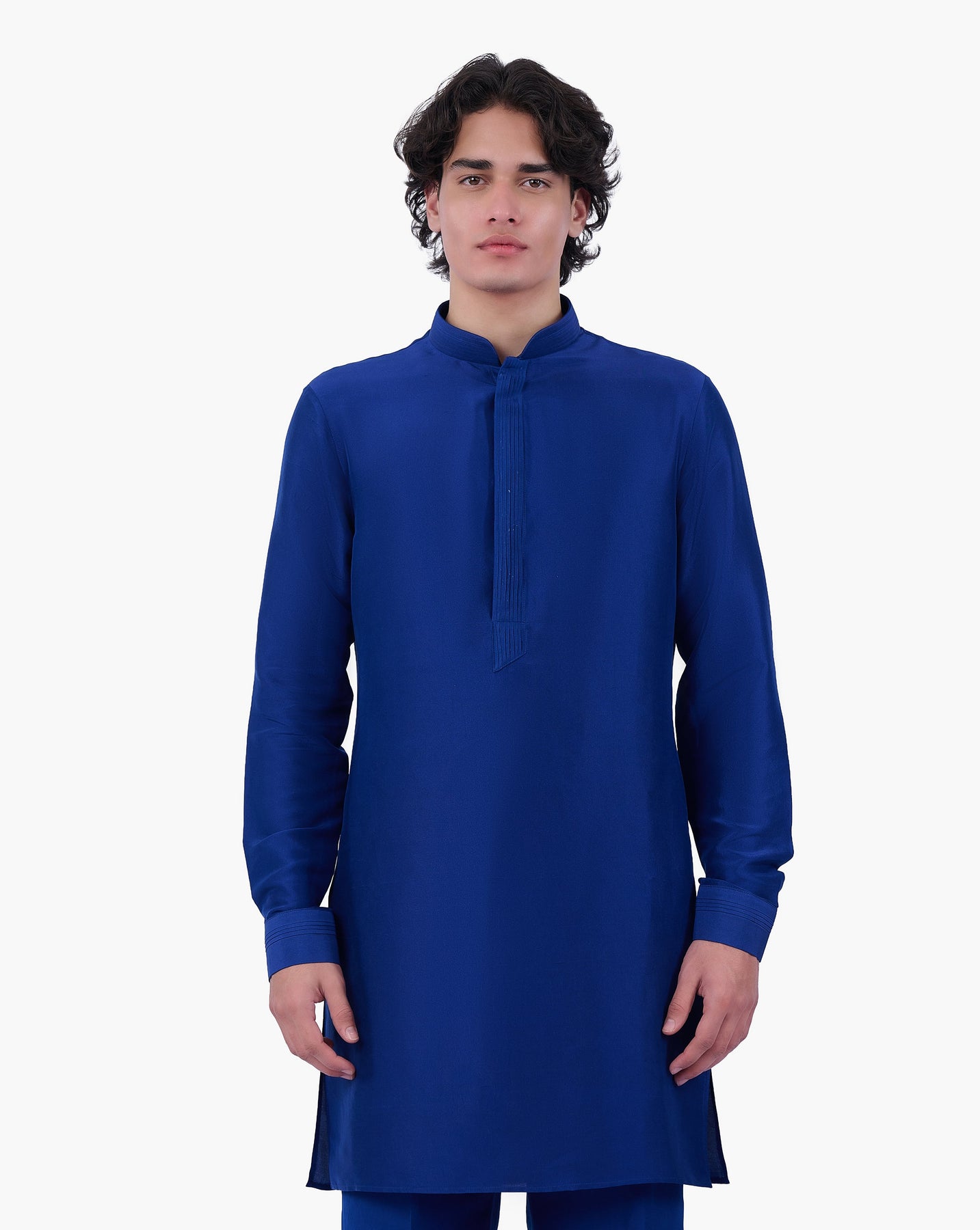 Royal blue dupion short kurta defined by refined front pleat detailing paired with matching trousers.
