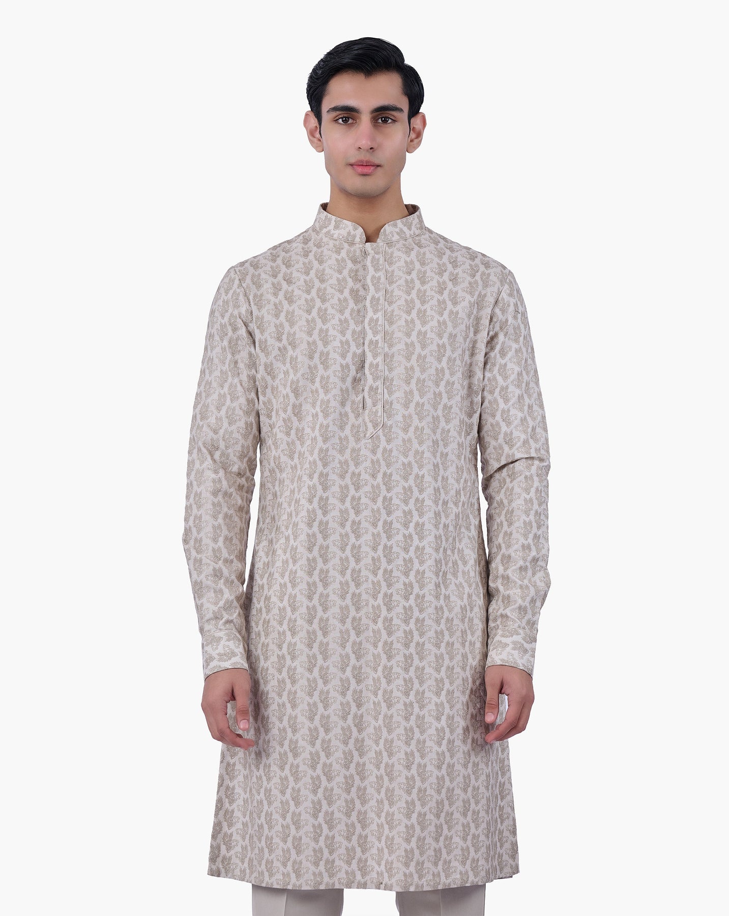 Pearl silk kurta finished with a sculptural winged panther embroidery paired with matching trousers.
