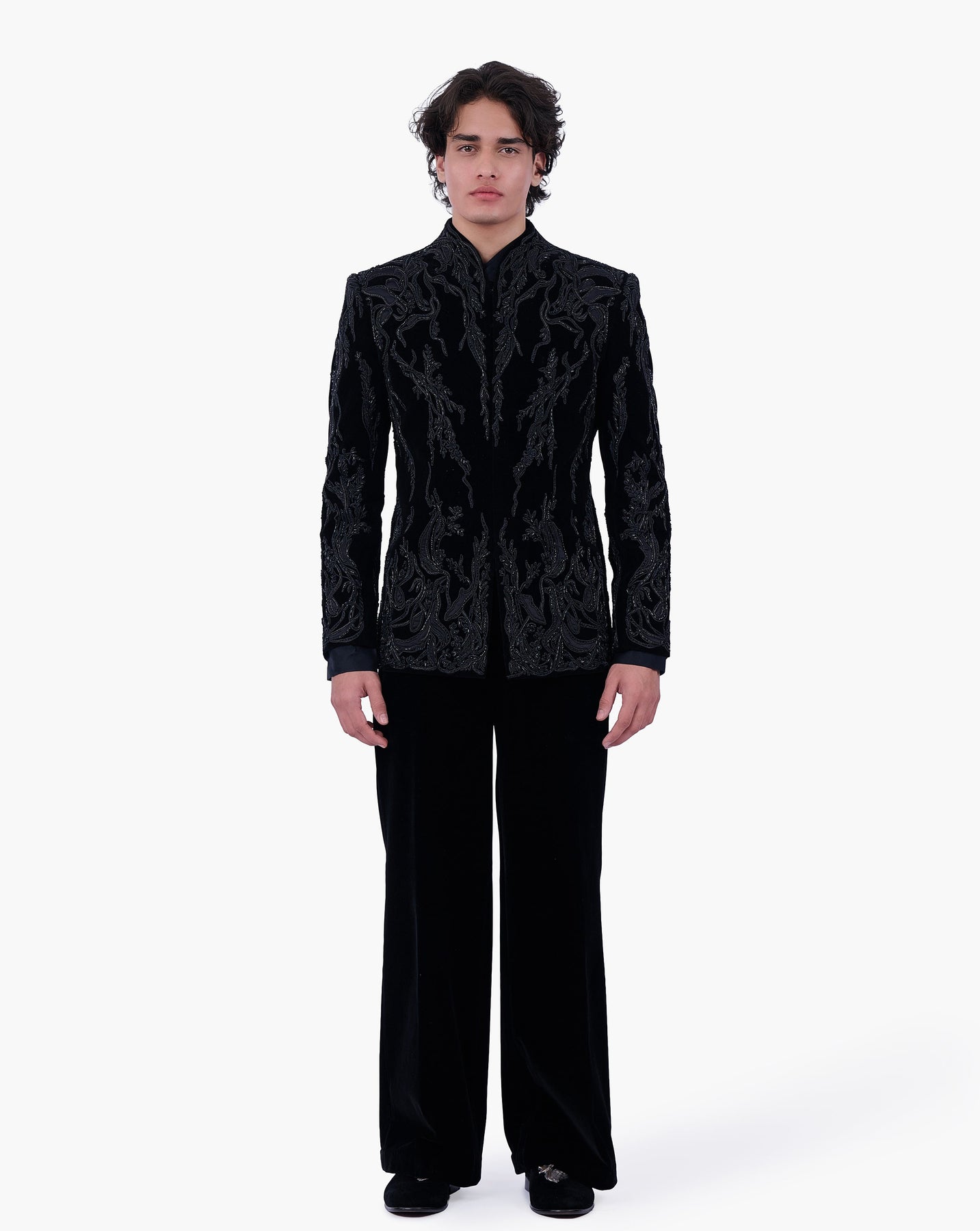 Black velvet bandhgala defined by art nouveau architectural lines, finished with dori and bugle bead embroidery.