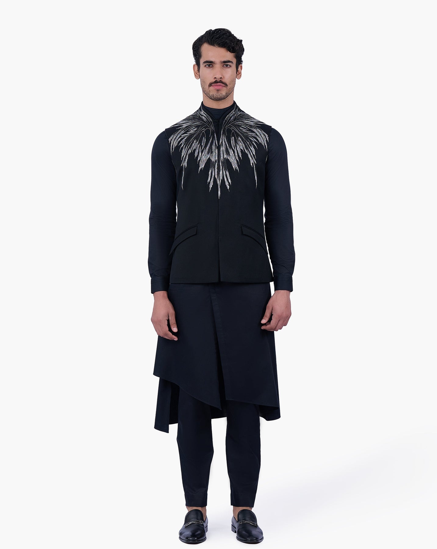Cosmic black Nehru jacket finished with sculptural wing embroidery.