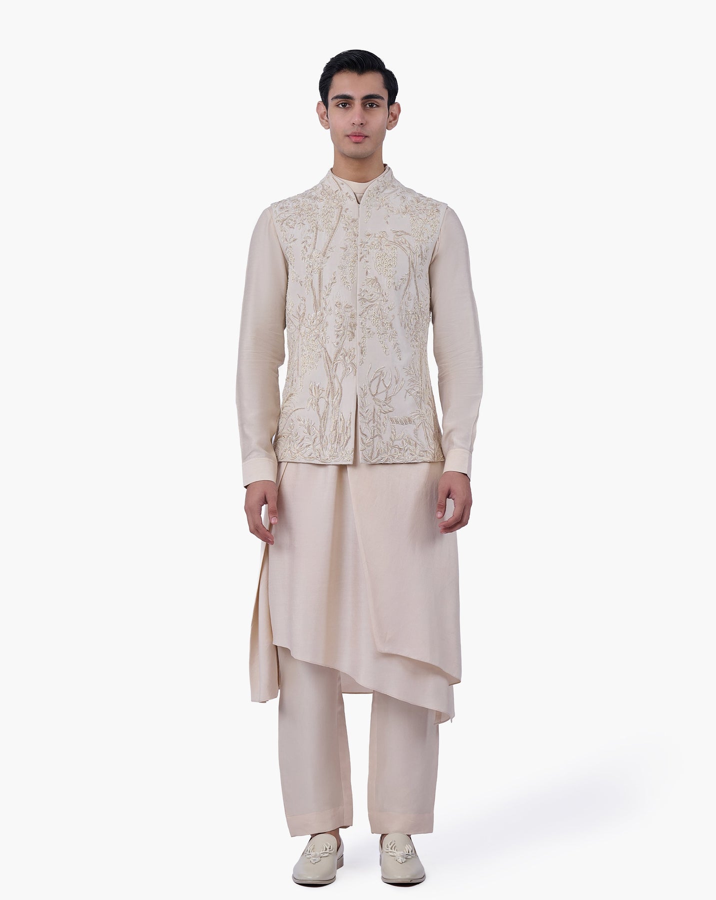 Champagne Nehru jacket finished with art nouveau line embroidery and mythic motifs.