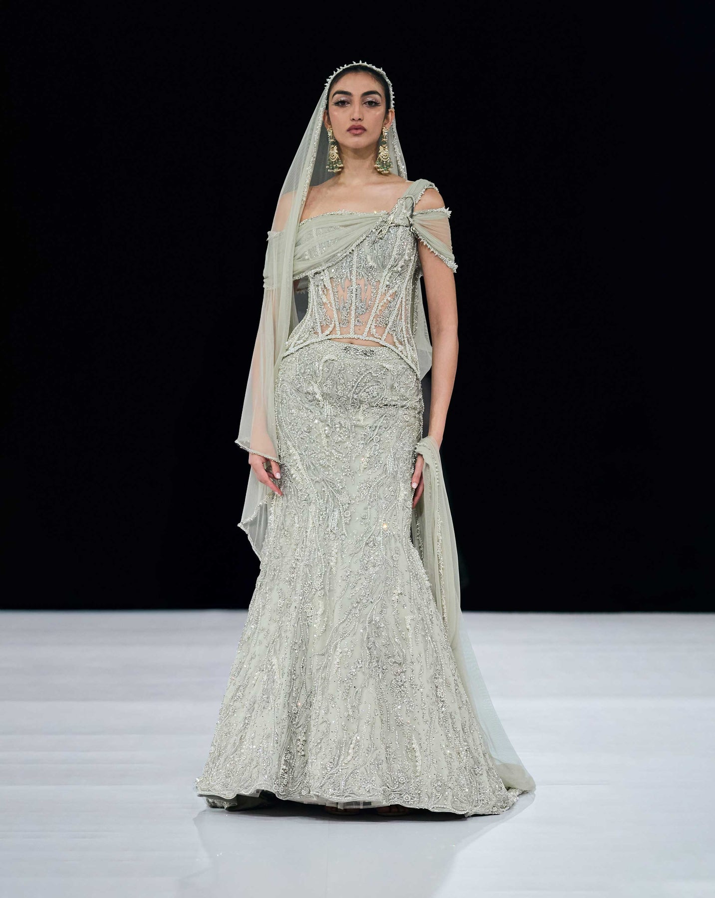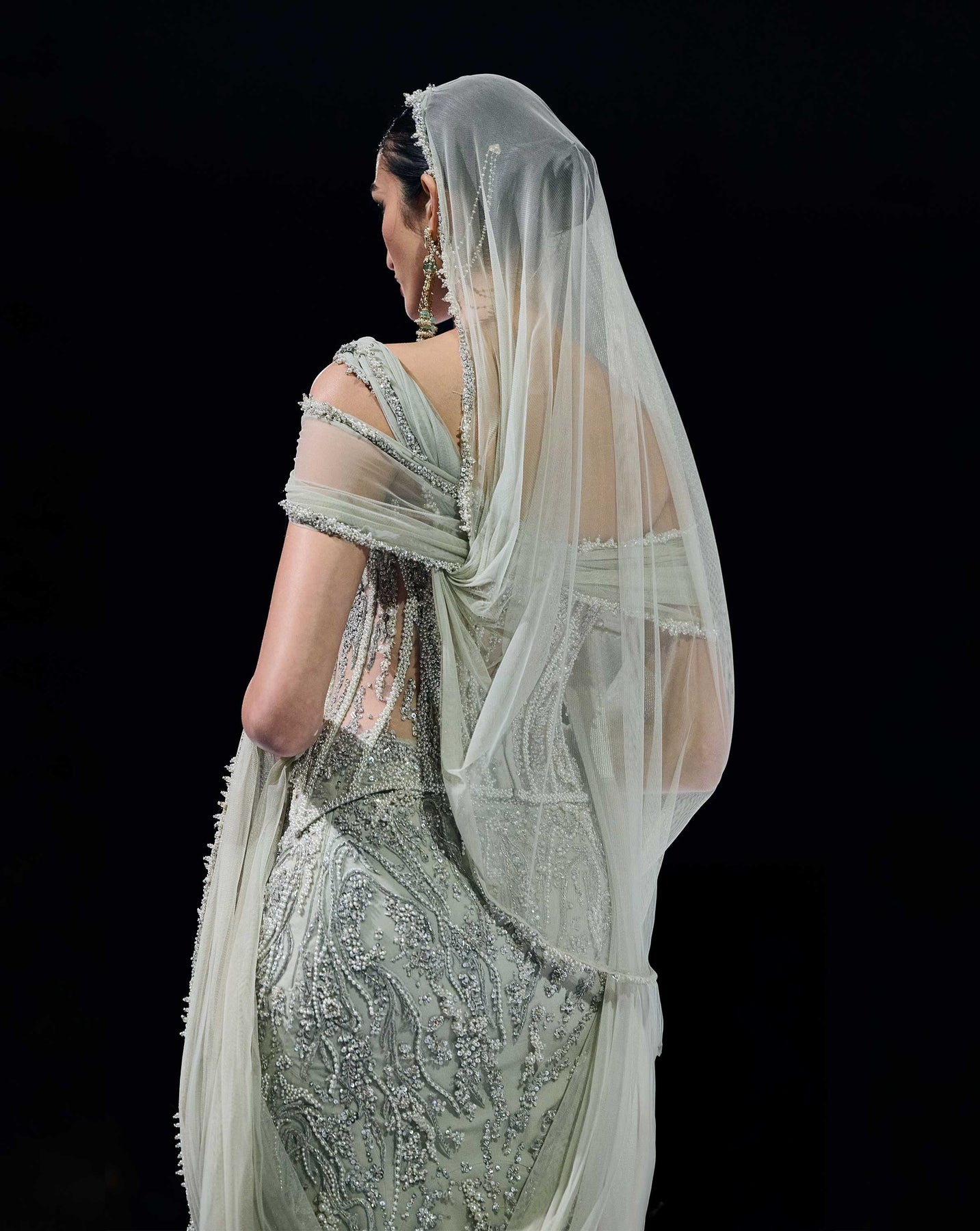 Crafted with glistening forest artwork inspired by Art-Nouveau sensibilities, this corseted lehenga is styled with a flowing tulle drape. Embellished with delicate pearl and zardozi embroidery, the lehenga is further adorned with the house’s signature metallic swan for a luminous yet contemporary look.