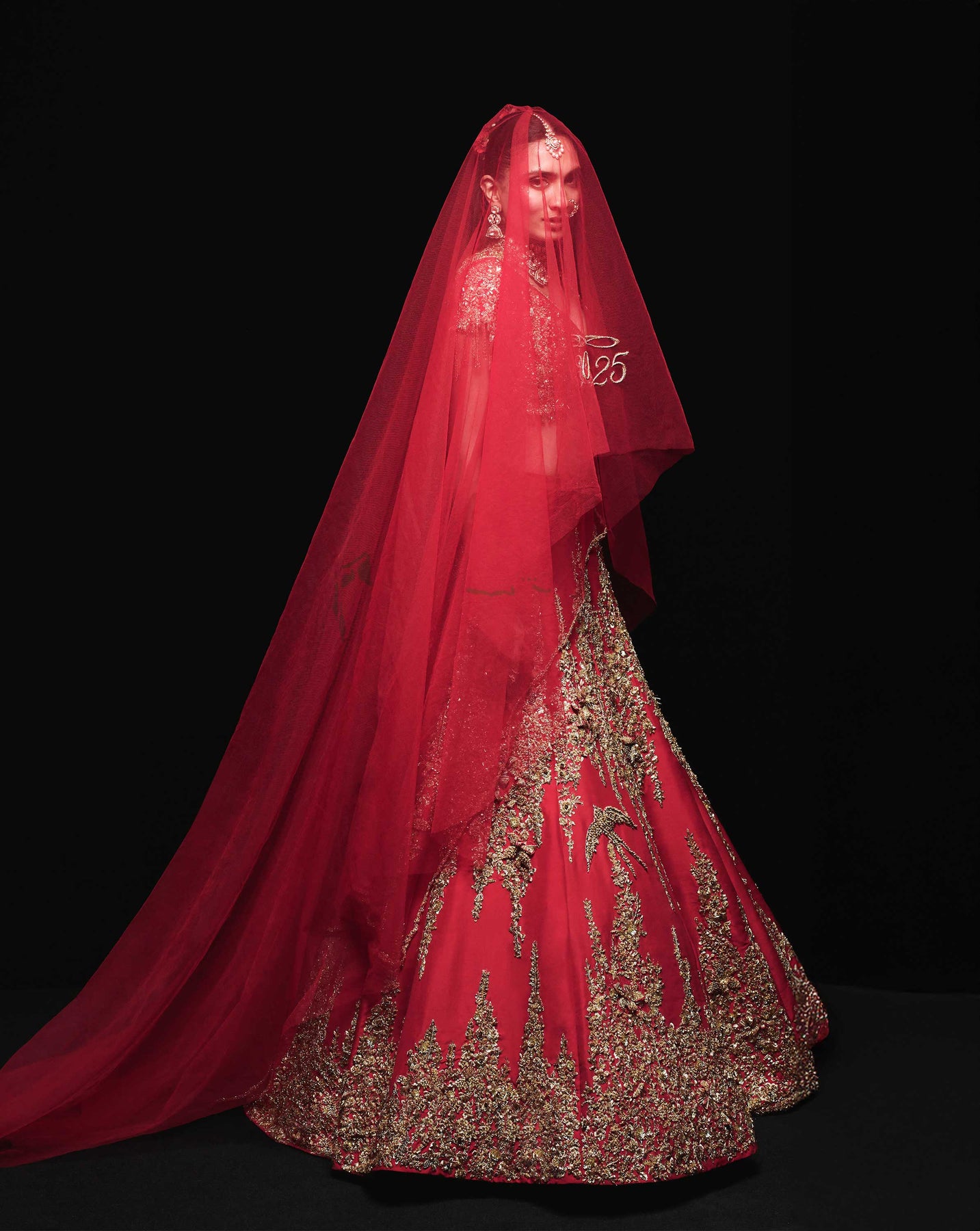 Born from the first light of dawn and the last flicker of flame, the Eos Ember lehenga blazes with a soft and melting bloom. Featuring zardozi work with enchanting floral and crystal bird embroidery, the lehenga merges rich artisanal detail and is paired with a veil.