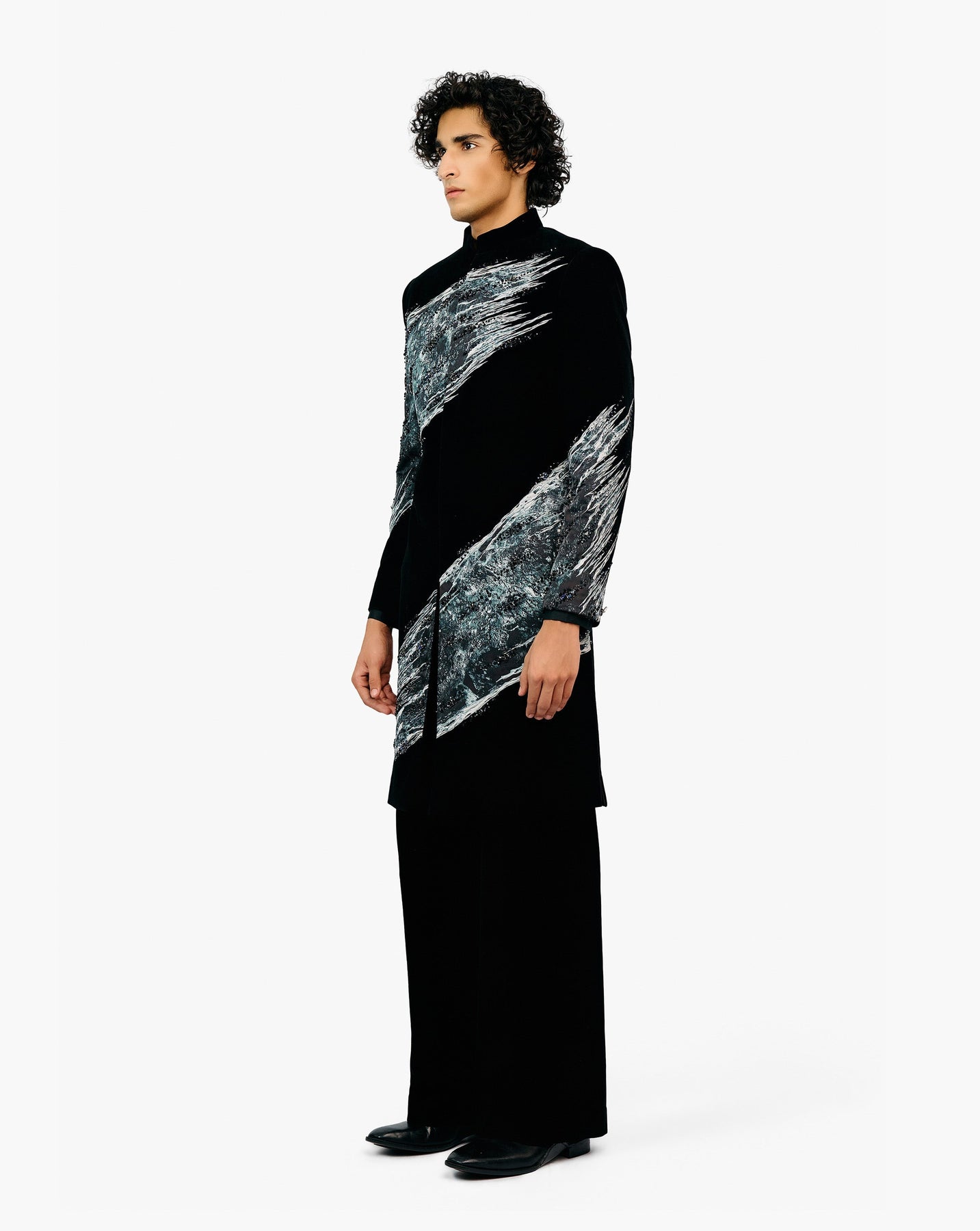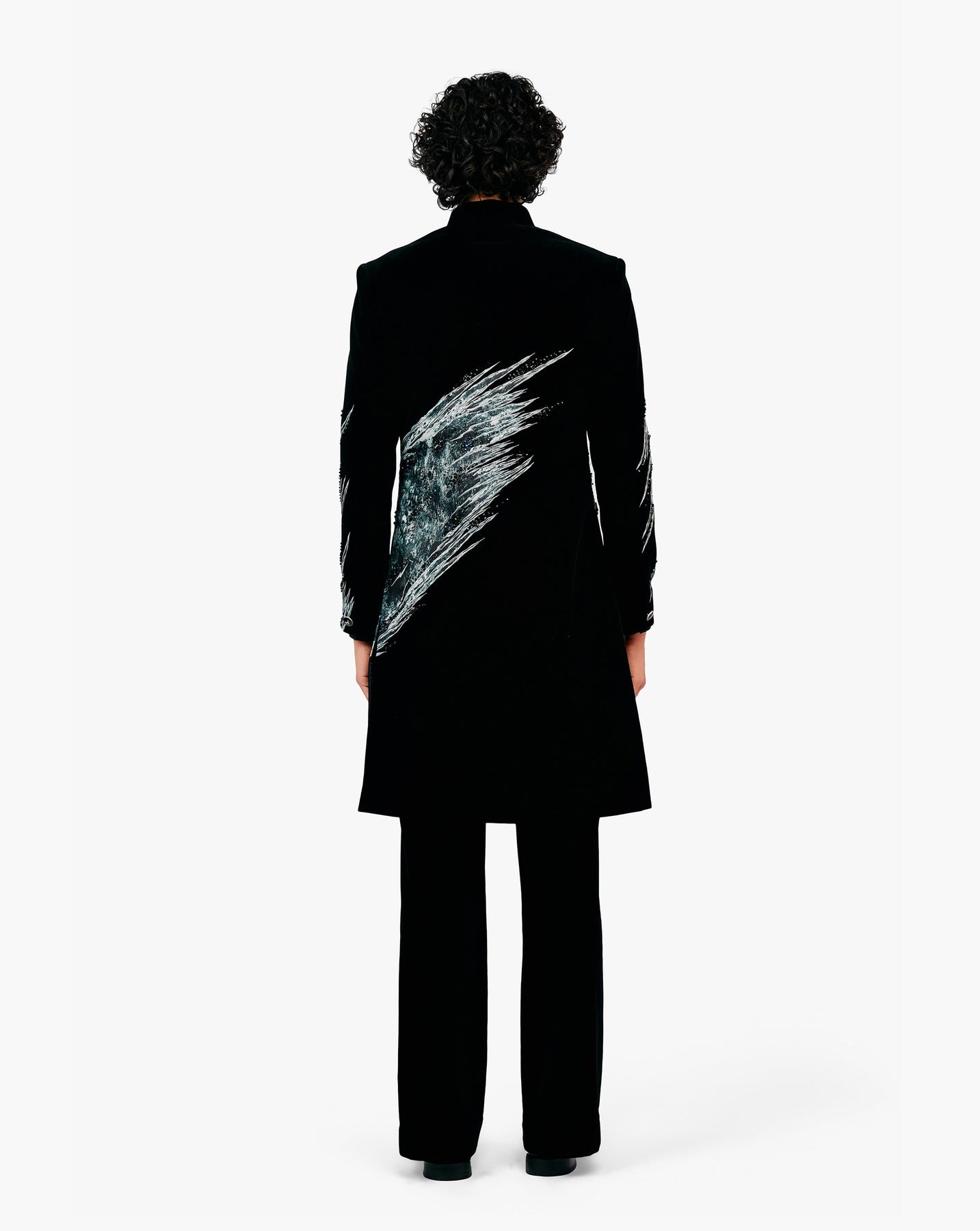 Black velvet meteor long jacket with appliqué crystal embroidery.