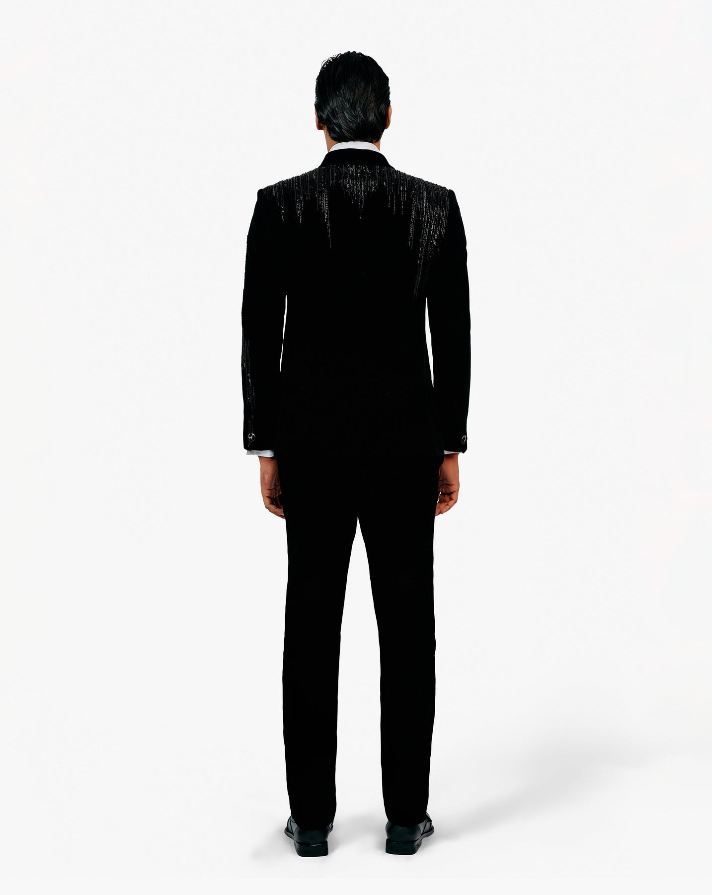 Black velvet tuxedo with tonal drip embroidery radiating across the body and sleeves.