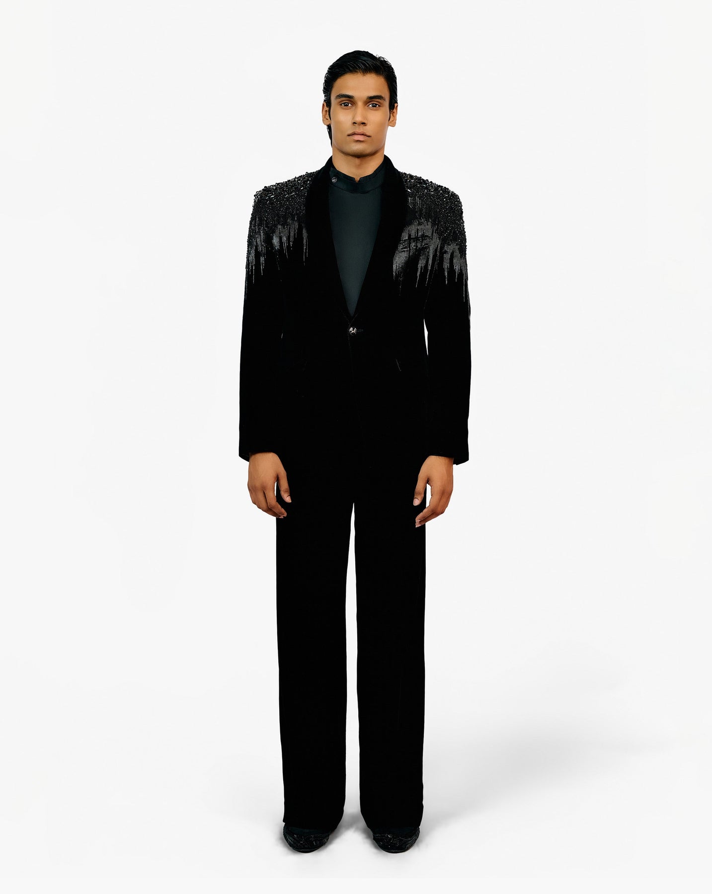 Midnight blue velvet tuxedo with bugle bead and crystal embroidery cascading from the shoulders.