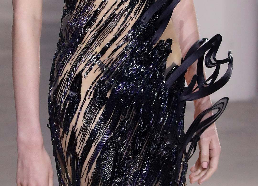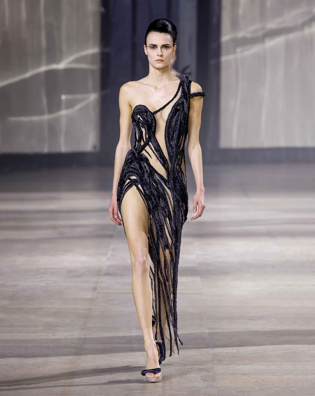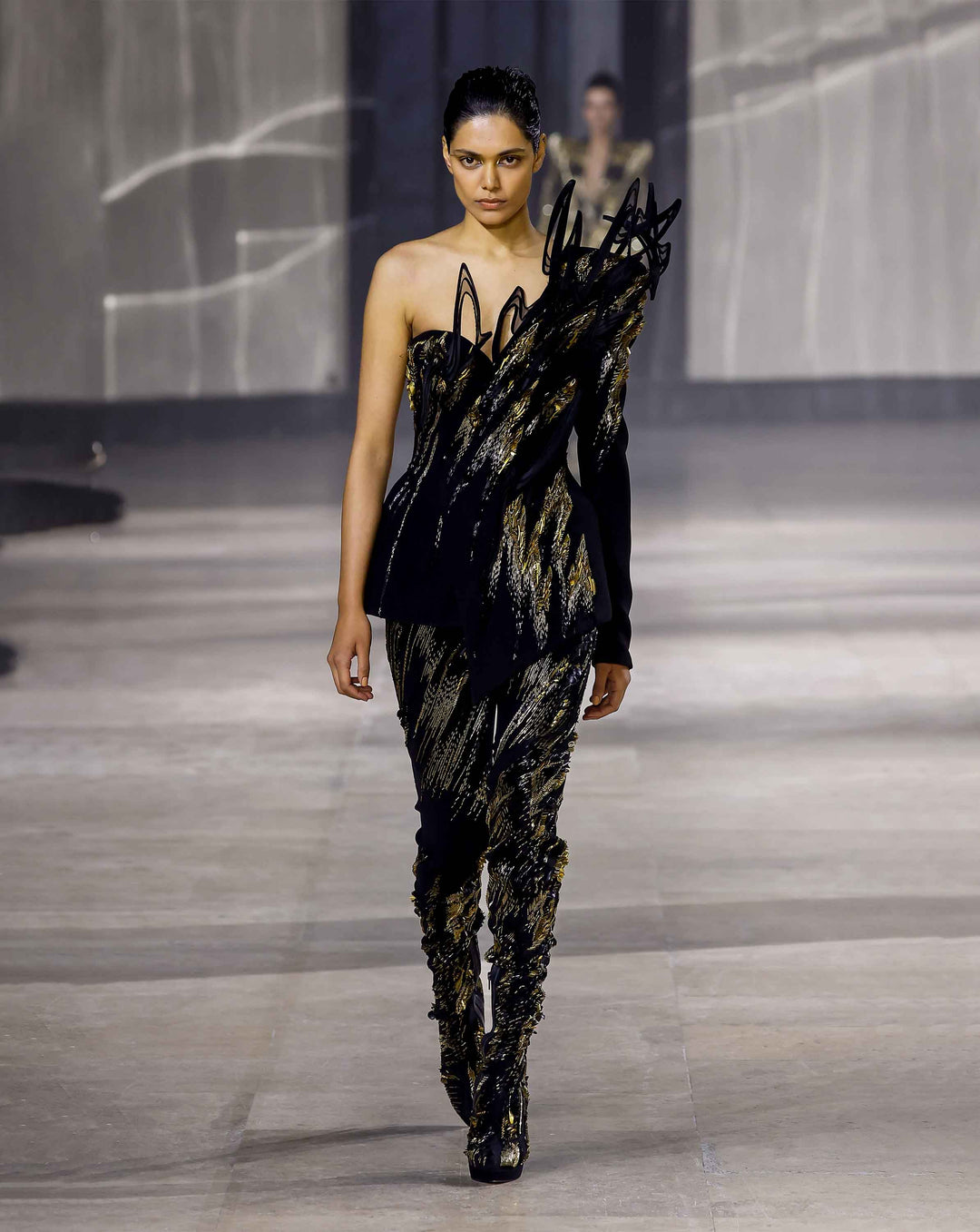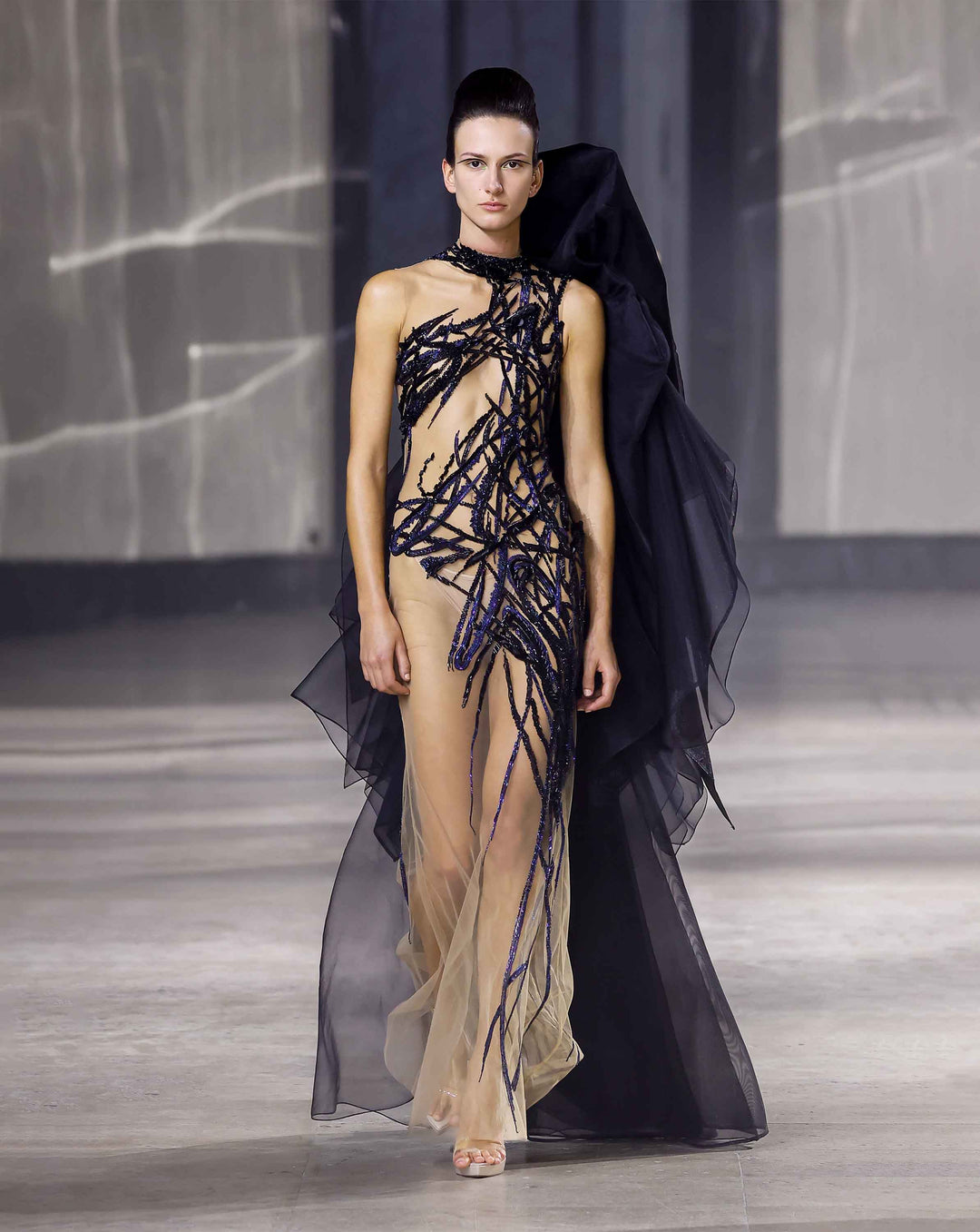 There are elemental dresses in black and nude strategically revealing the form in its pristine state. Meteoric light embroideries emulate melting lava or deep waves of a very dark ocean. There is also a garbage like dress with abstract entangled wires as embroideries. There is a snake dress slithering and intertwining all through the body. The snakes, inspired by the kundalini, softly meander on the body in hand-embroidered waves.