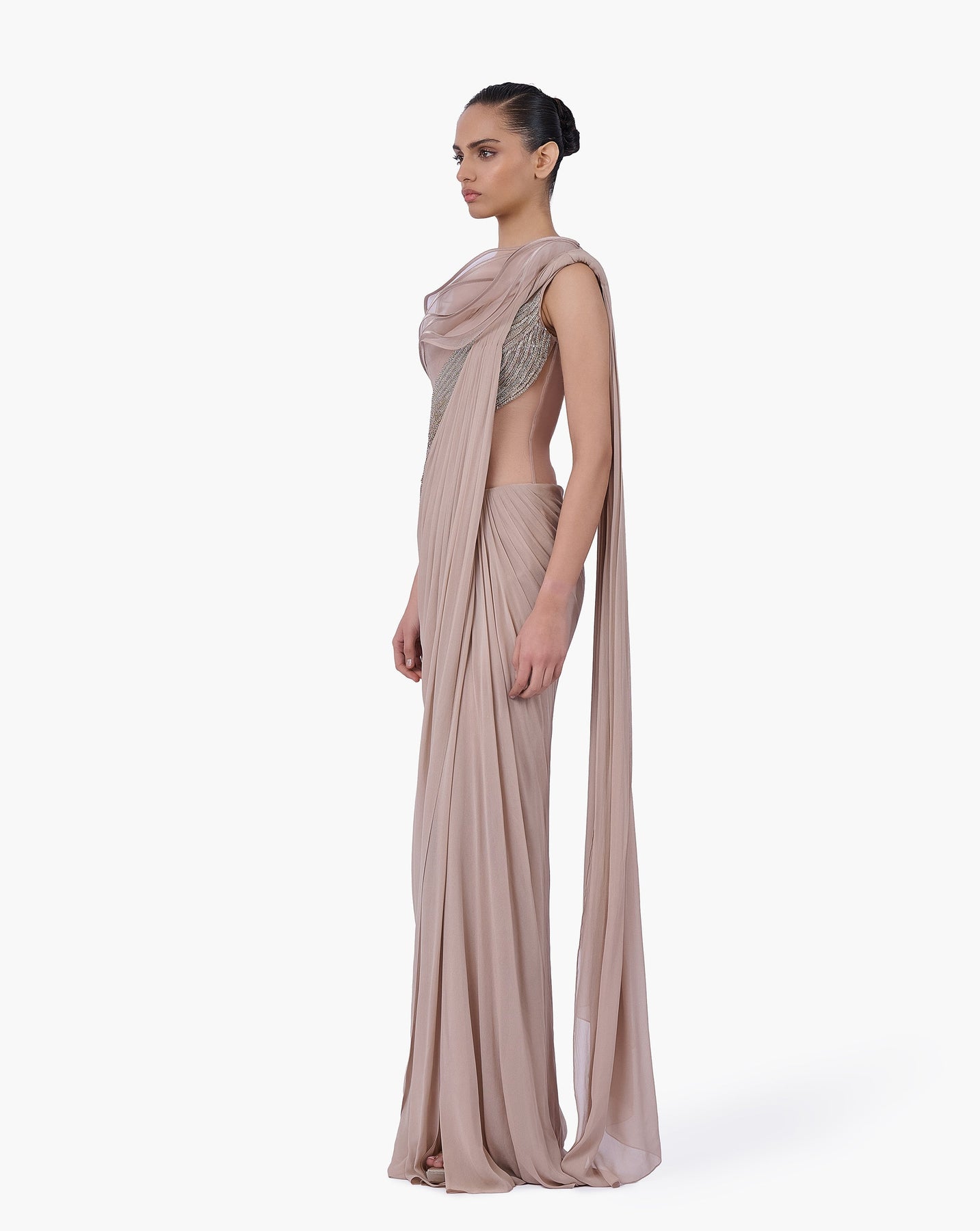 Light champagne saree gown featuring fluid asymmetric draping, a softly contoured bodice, and an elongated fall that cascades into a gentle, trailing hem.