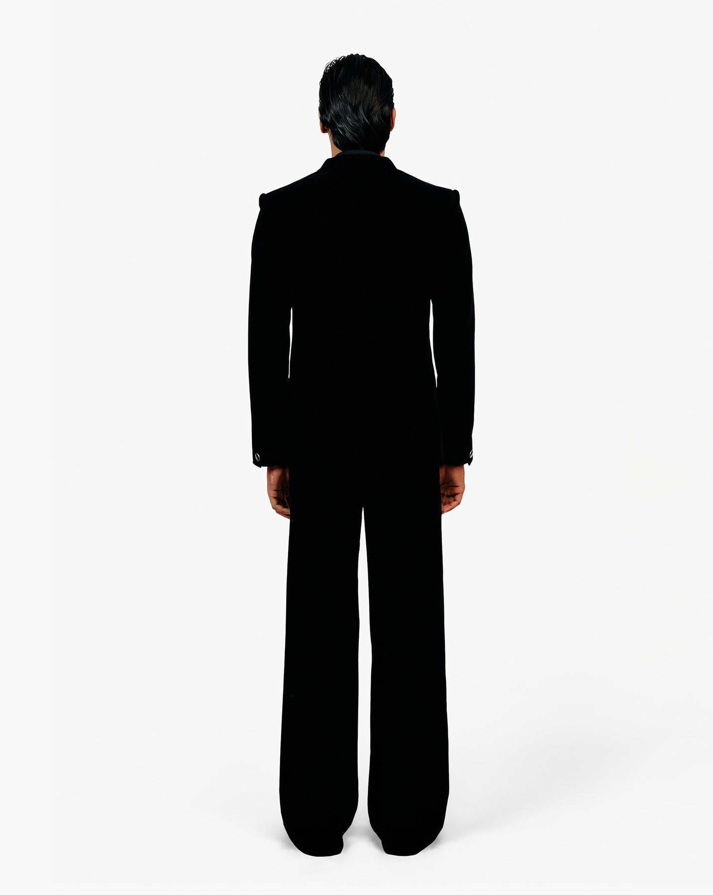Black velvet tuxedo with appliqué fringe embroidery.