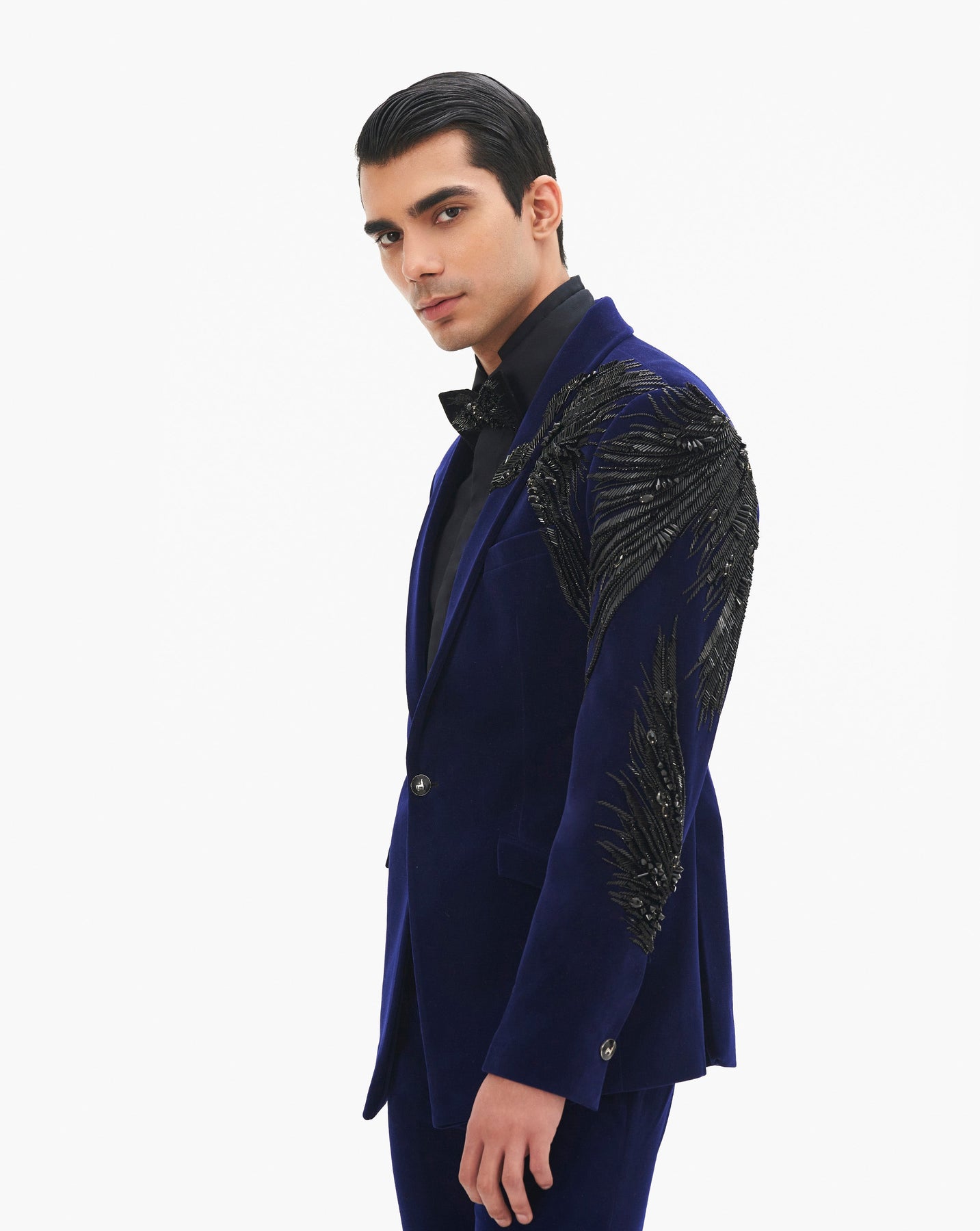 Sapphire velvet tuxedo featuring tonal lapel with contrasting 3D bird embroidery across one shoulder.