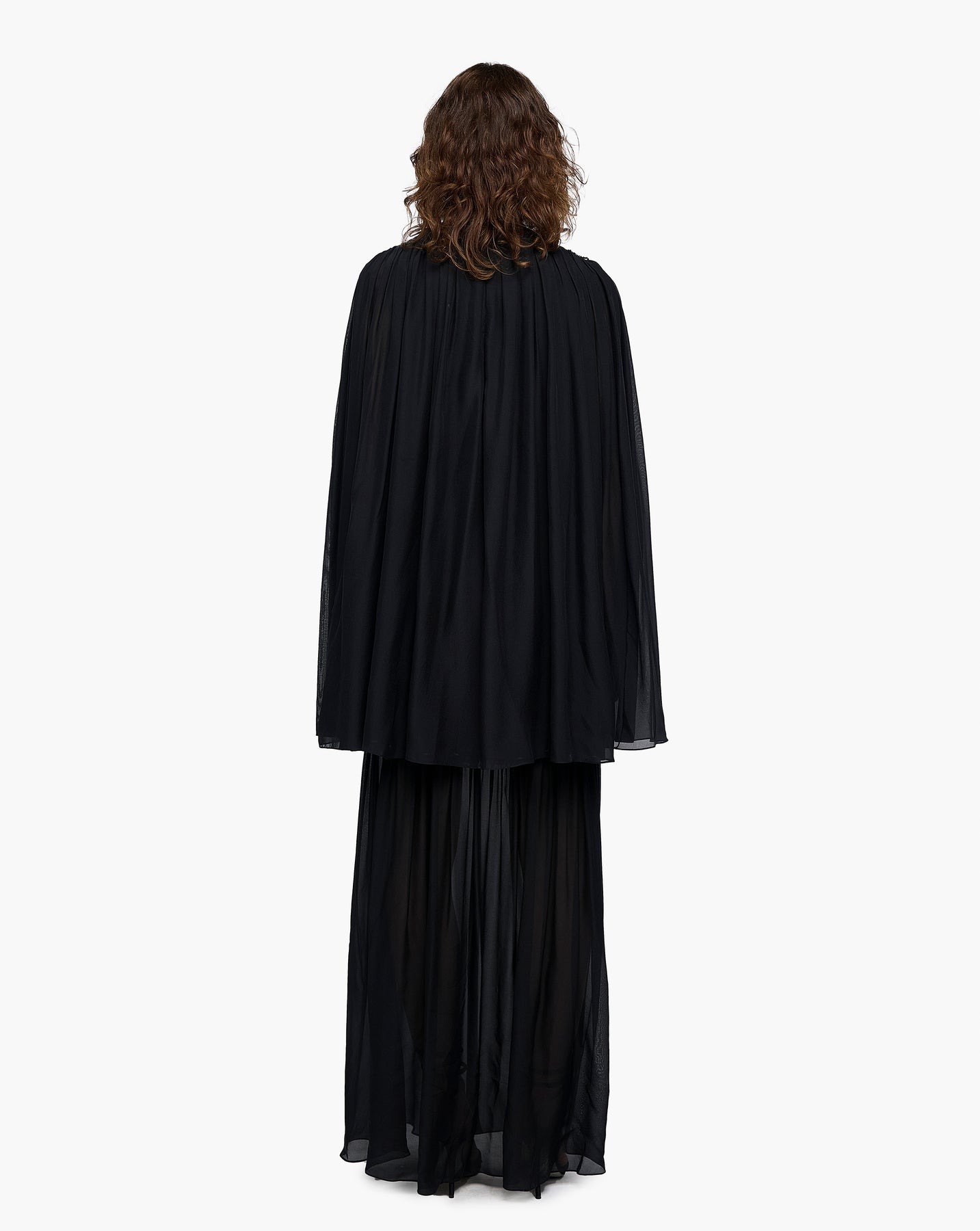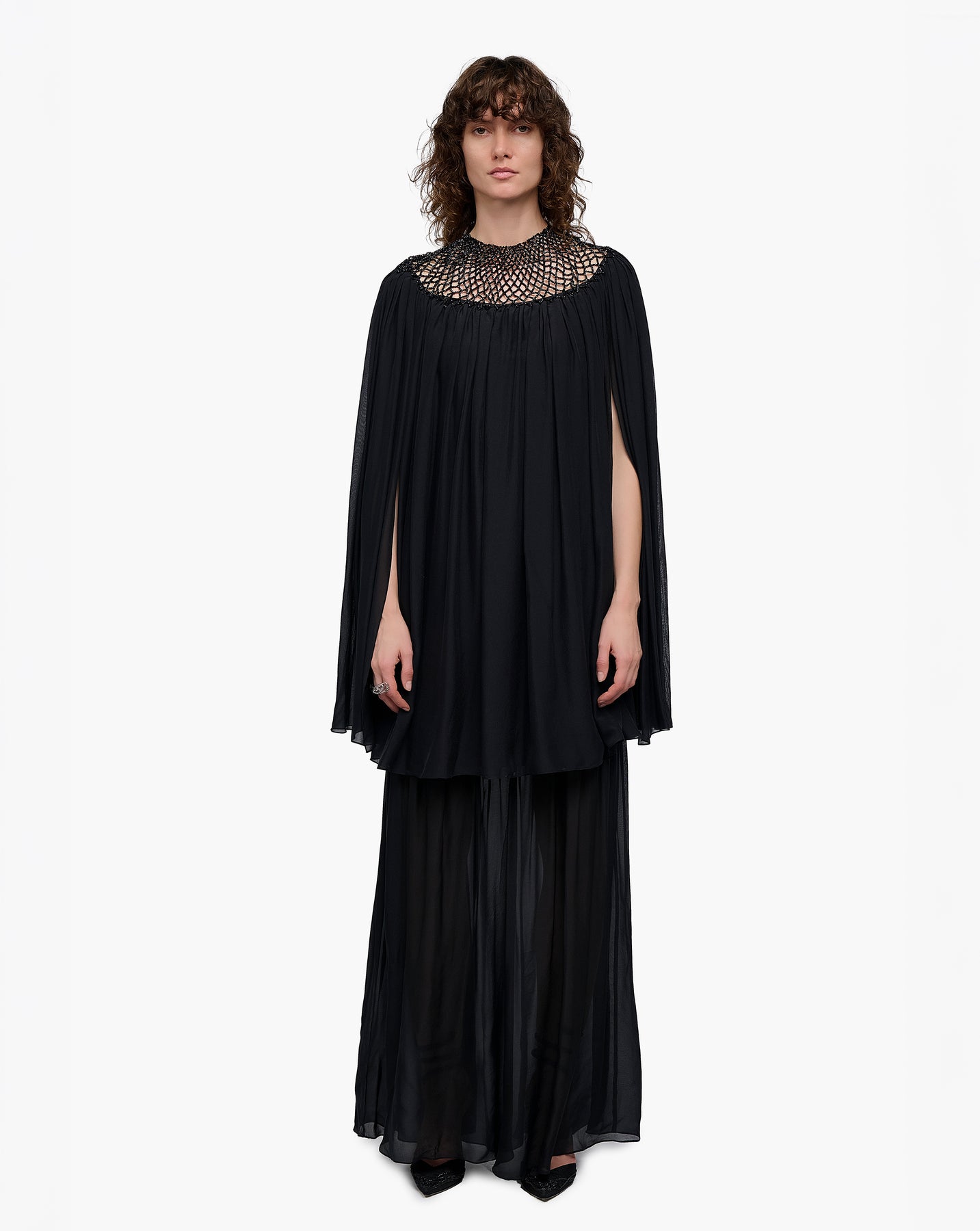 A black draped top with crystal macramé air-beading, paired with a chiffon flared skirt featuring a crepe panel at the hip.