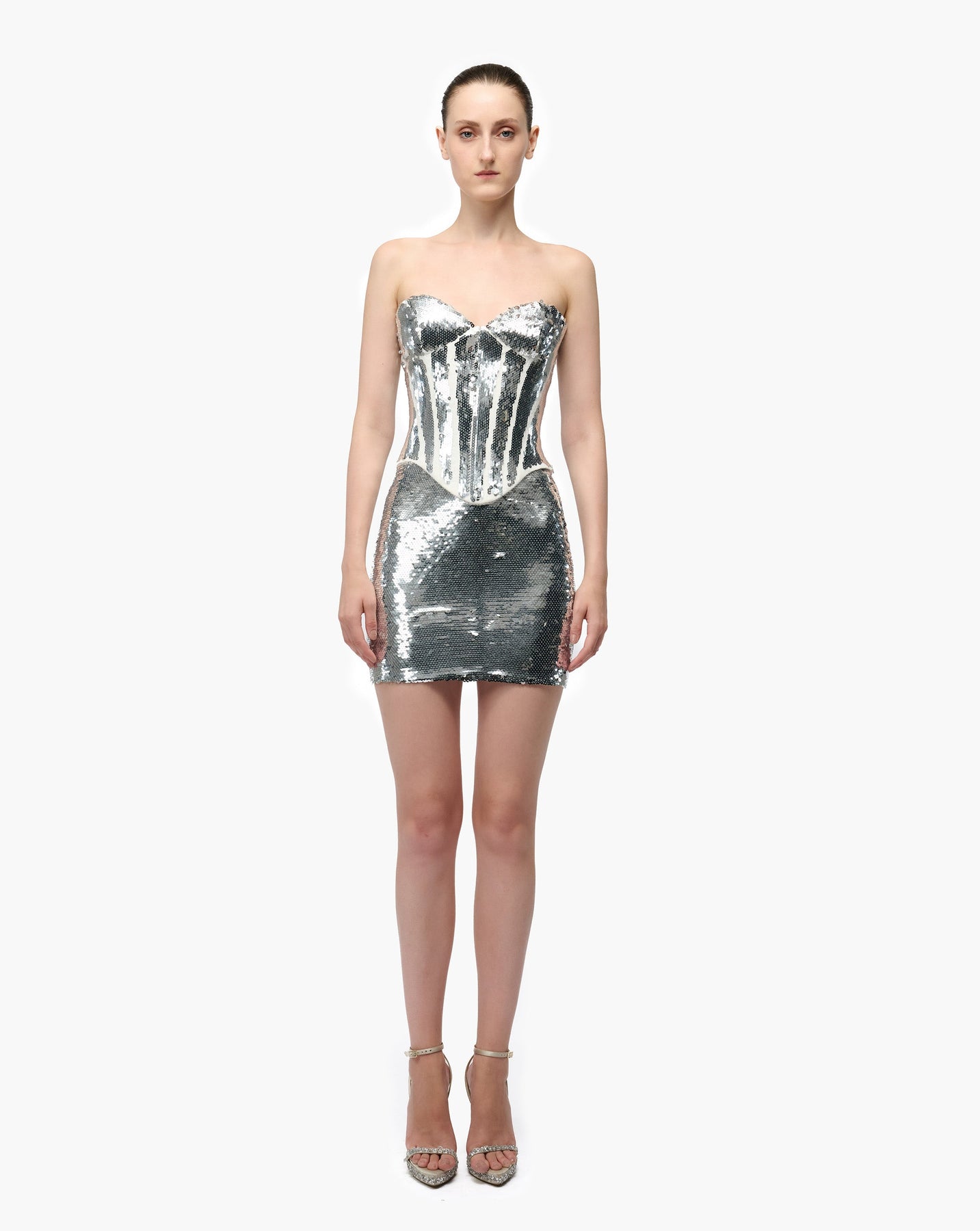 Disco silver sequin corset top with an asymmetric wave hemline paired with a contoured mini skirt.