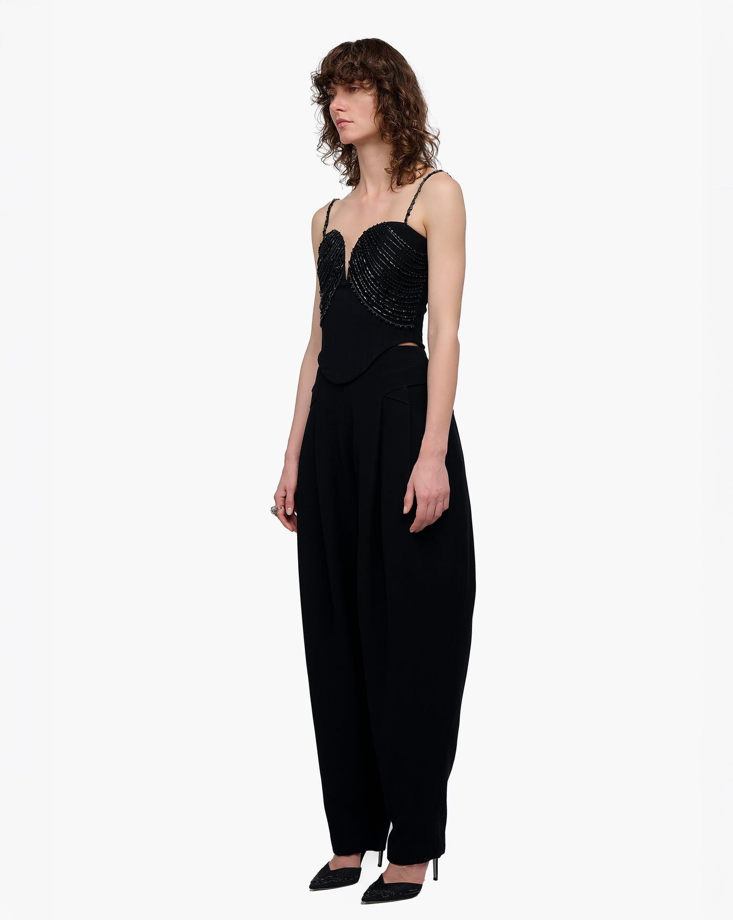 black crepe trousers featuring directional draping.