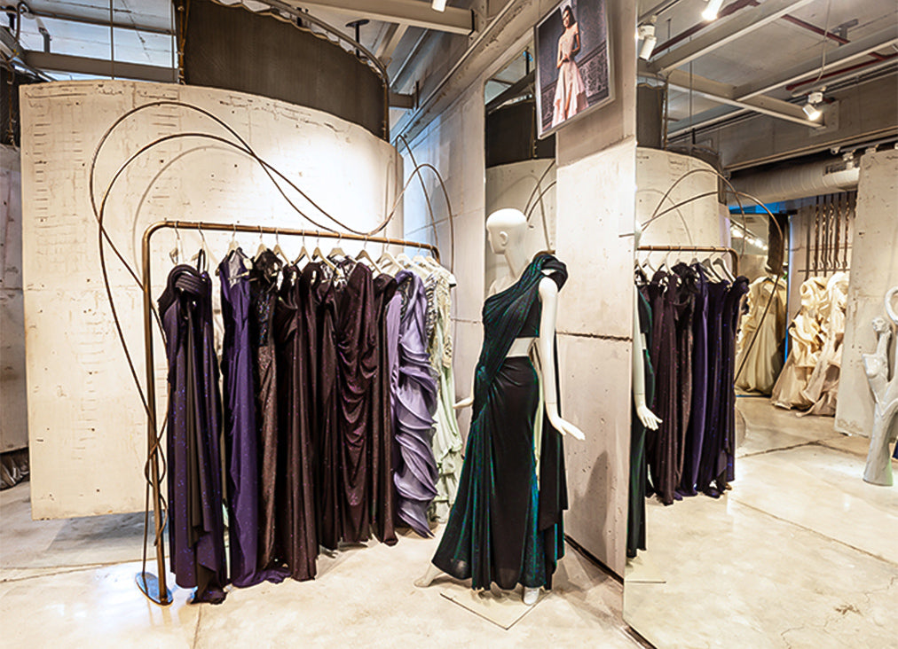 The 1,250 sq.ft space is conceived as an immersive environment sculpted in monochrome. Sinuously warping cast concrete walls seem to surreally float within the relatively tight volume, and slice the space into two zones without dividing it. As you meander through, there is a constant sense of reveal and discovery. The store has a sense of stark honesty in its conception and execution through its raw materiality.