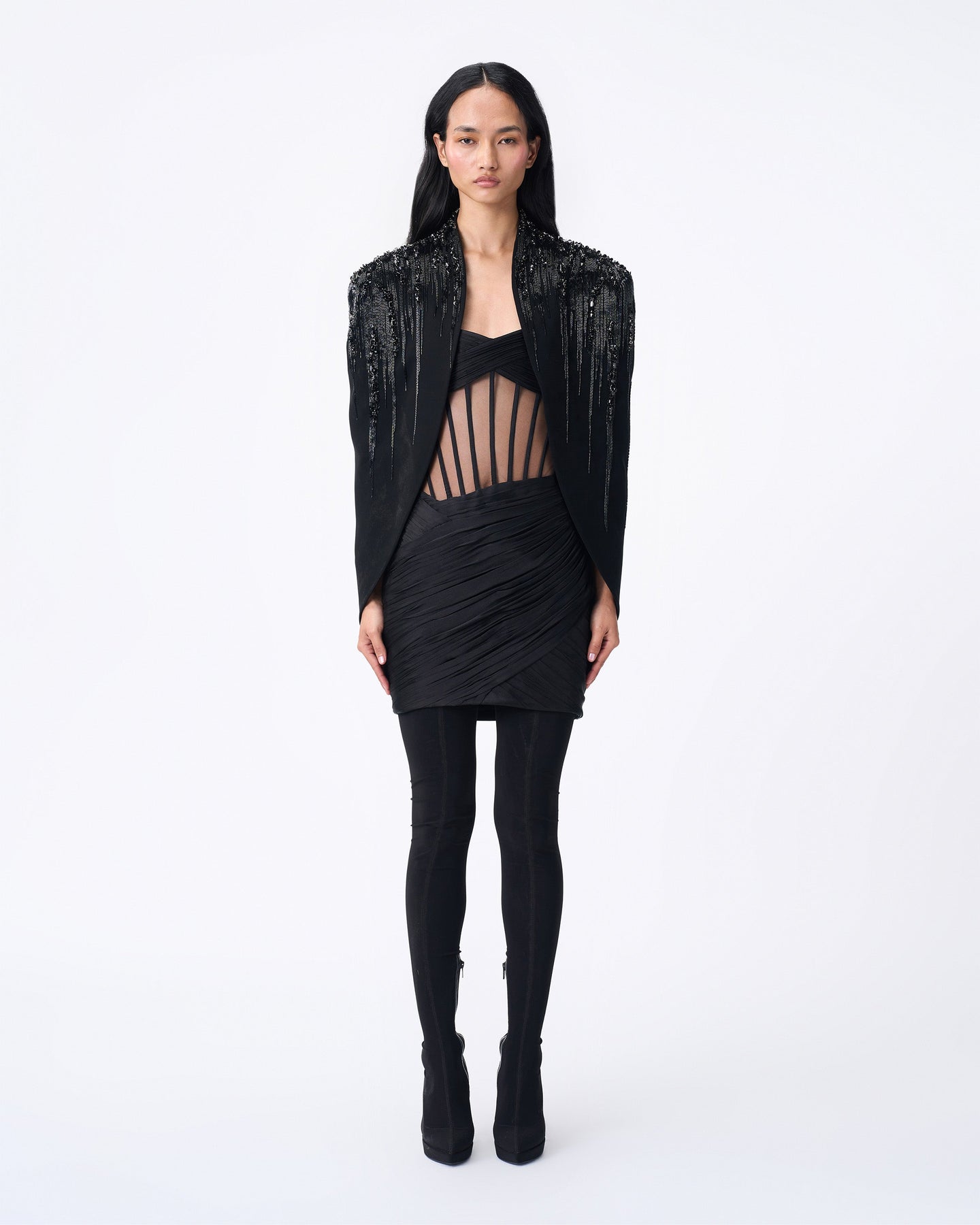Black Lightfall-Embroidered Cape Encrusted with Crystals and Bugle Beads