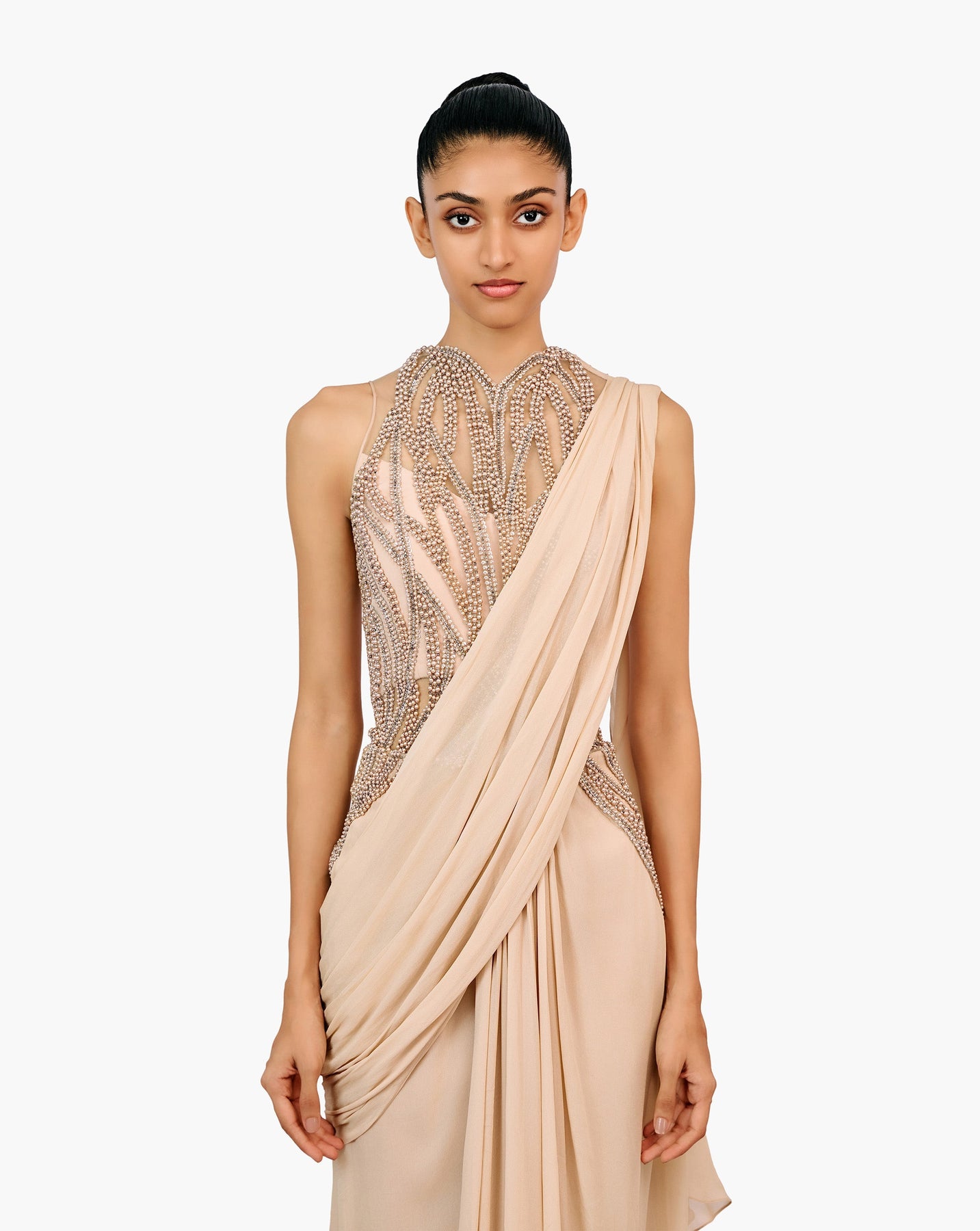 Sleeveless nude pink saree gown with pearl and buggle bead embroidery.